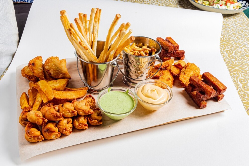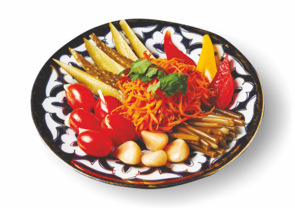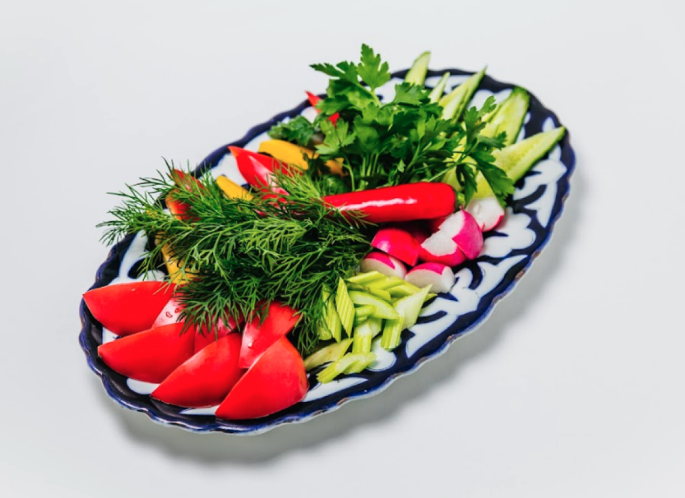 Блюдо из отборных овощей: томат, огурец, сладкий перец, молодой редис, сельдерей, острый перец и ароматная зелень. Подается с соусом Цахтоне.