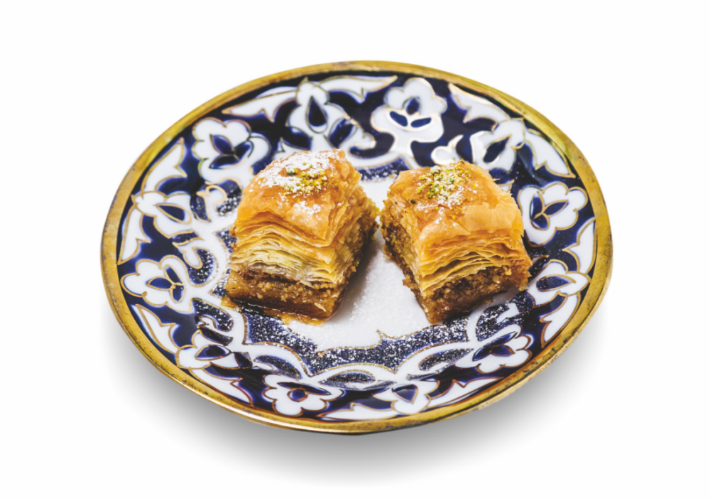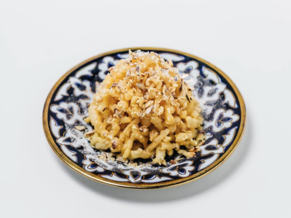 Традиционная восточная сладость из воздушного хрустящего теста с добавлением меда. Десерт посыпается грецким орехом и сахарной пудрой.