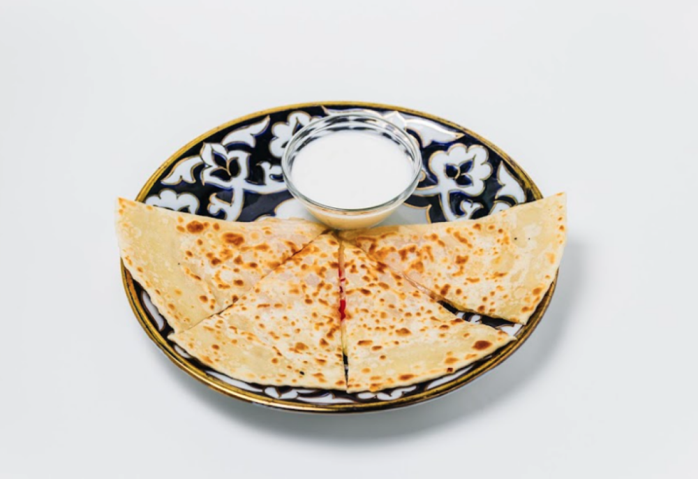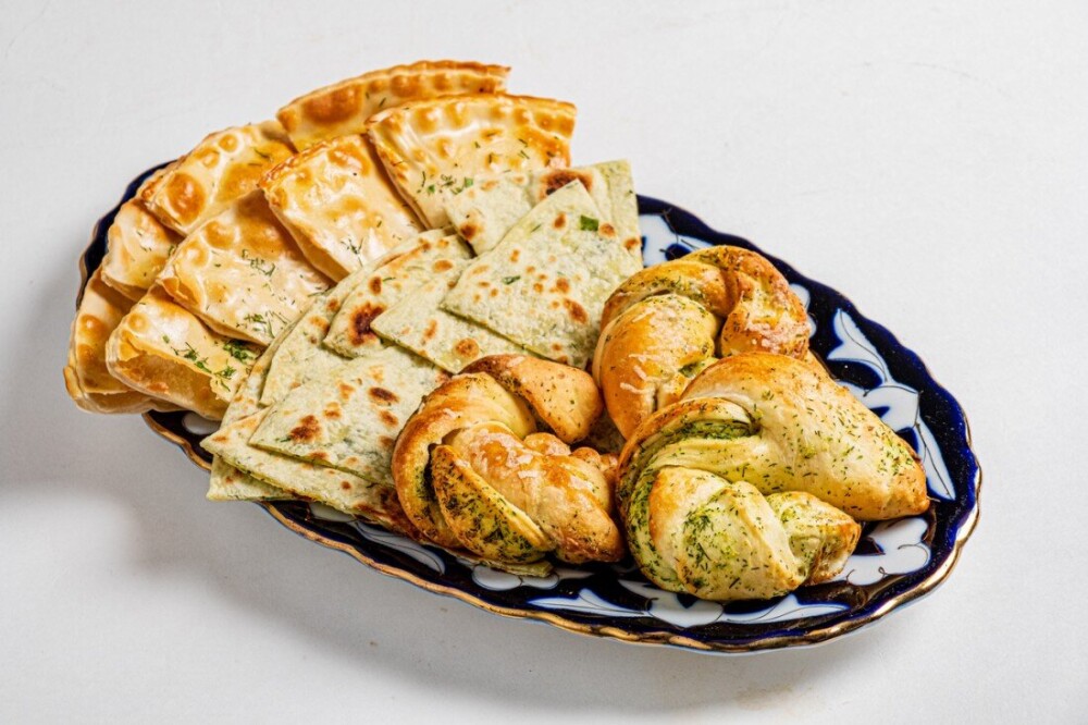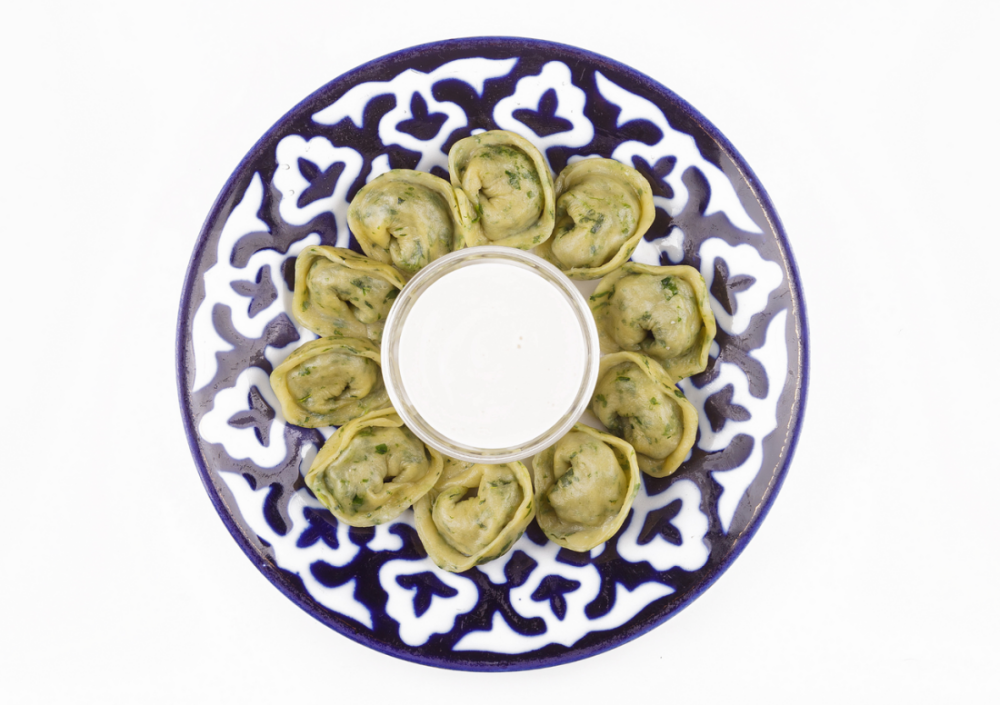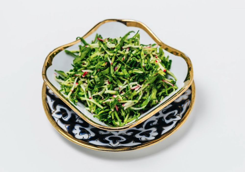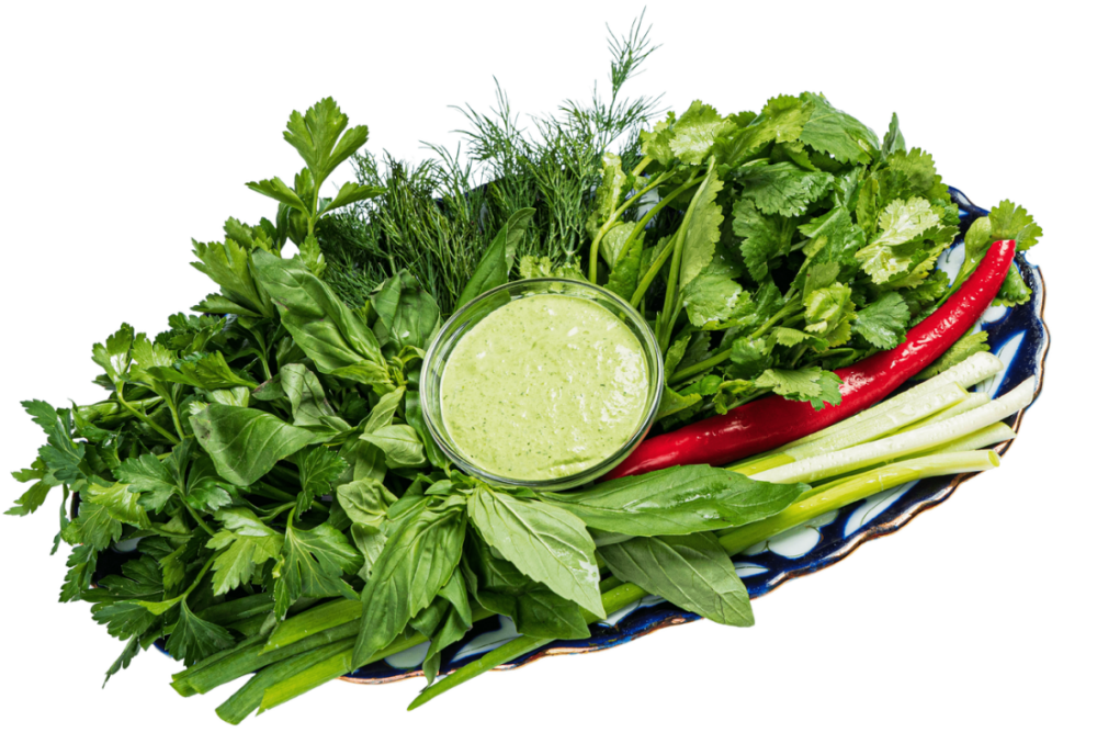 Ароматная кинза, базилик, укроп, зелёный лук и петрушка. К блюду подаётся соус цахтоне и острый перецчили.