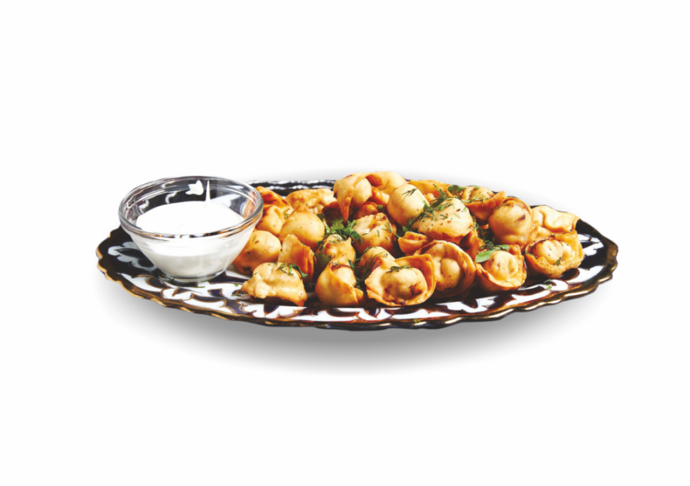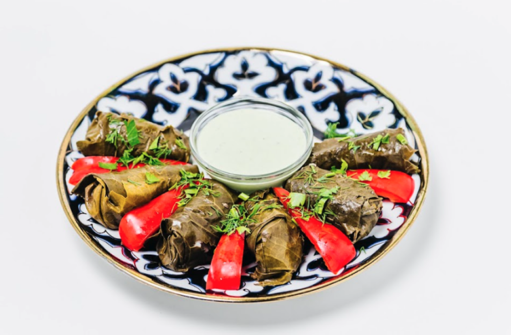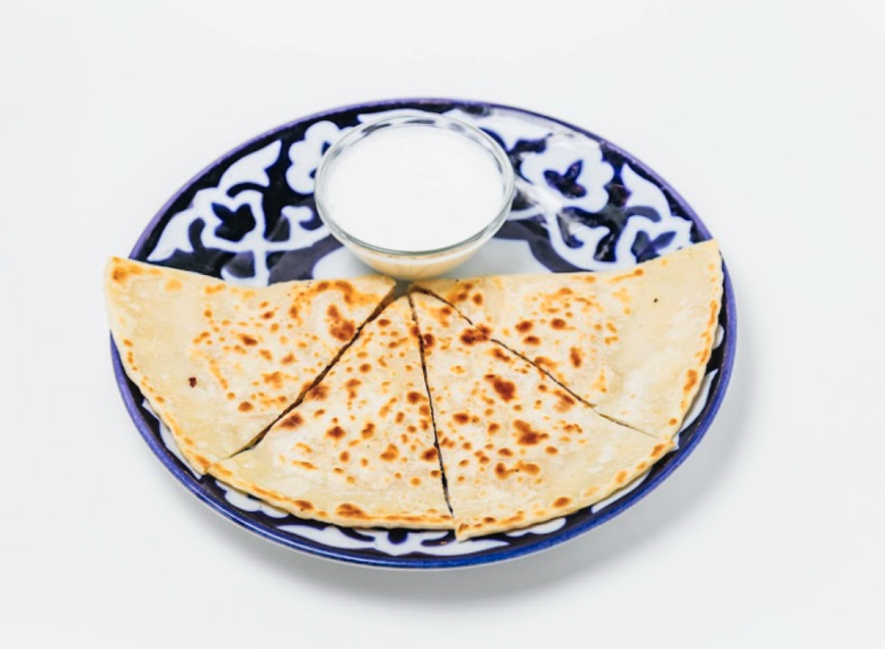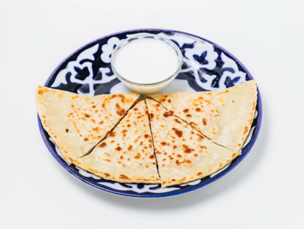 Ароматная кинза, базилик, укроп, зелёный лук и петрушка. К блюду подаётся соус цахтоне и острый перецчили.