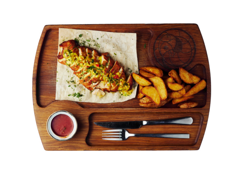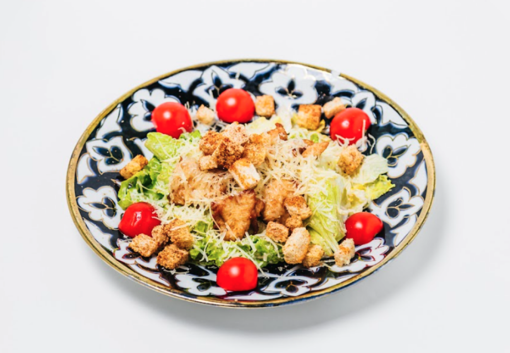 Обжаренное куриное филе, салат айсберг и лола, томаты черри, сыр пармезан. Посыпается салат гренками, заправляется фирменным соусом от шеф- повара.