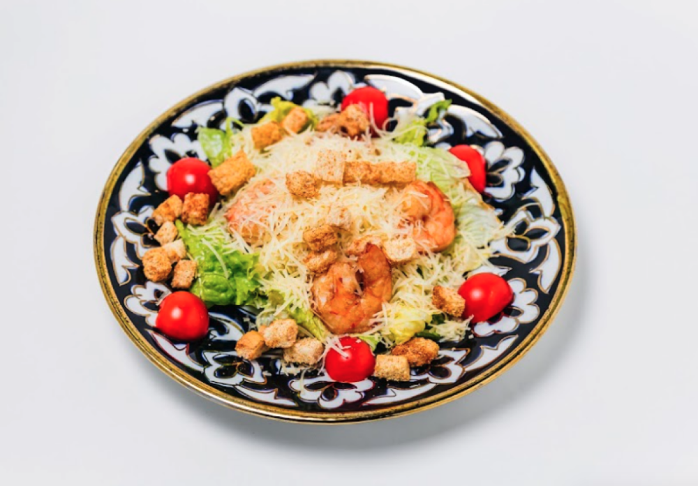 Обжаренные креветки, салат айсберг и лола, томаты черри ,сыр пармезан. Посыпается салат гренками, заправляется фирменным соусом от шеф-повара.