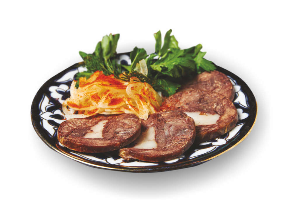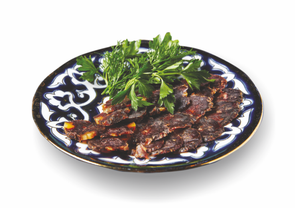 Классическая узбекская колбаса из конины. Подается с луком и петрушкой.