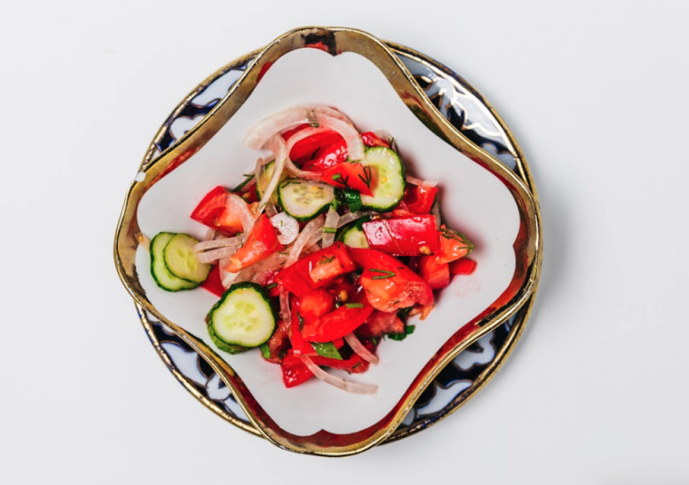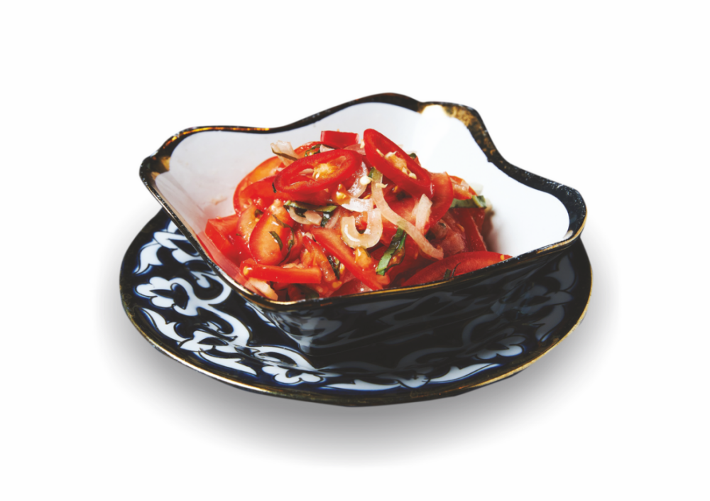 Салат из спелых сочных томатов, репчатого лука, острого перца и базилика. Заправляется растительным маслом. Рекомендуется к плову.