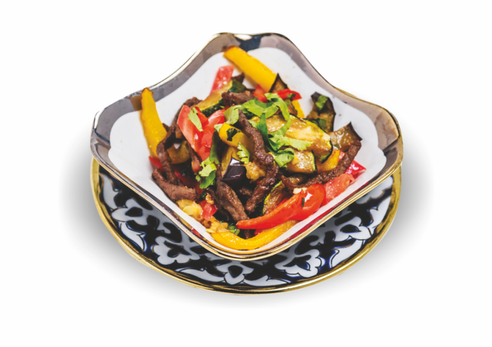 Теплый салат из нежной обжаренной говядины, баклажанов, цукини, запеченного сладкого перца, томатов с добавлением чеснока и кинзы.