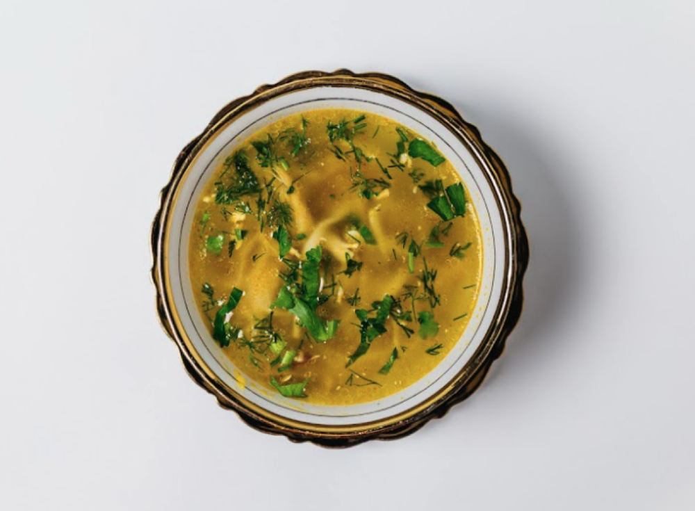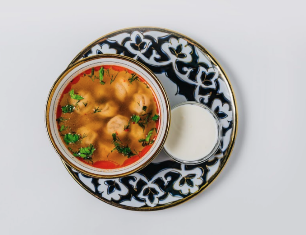 Пельмешки начиненные бараниной и луком с бульоном и ароматной зеленью. Суп подается со сметаной.