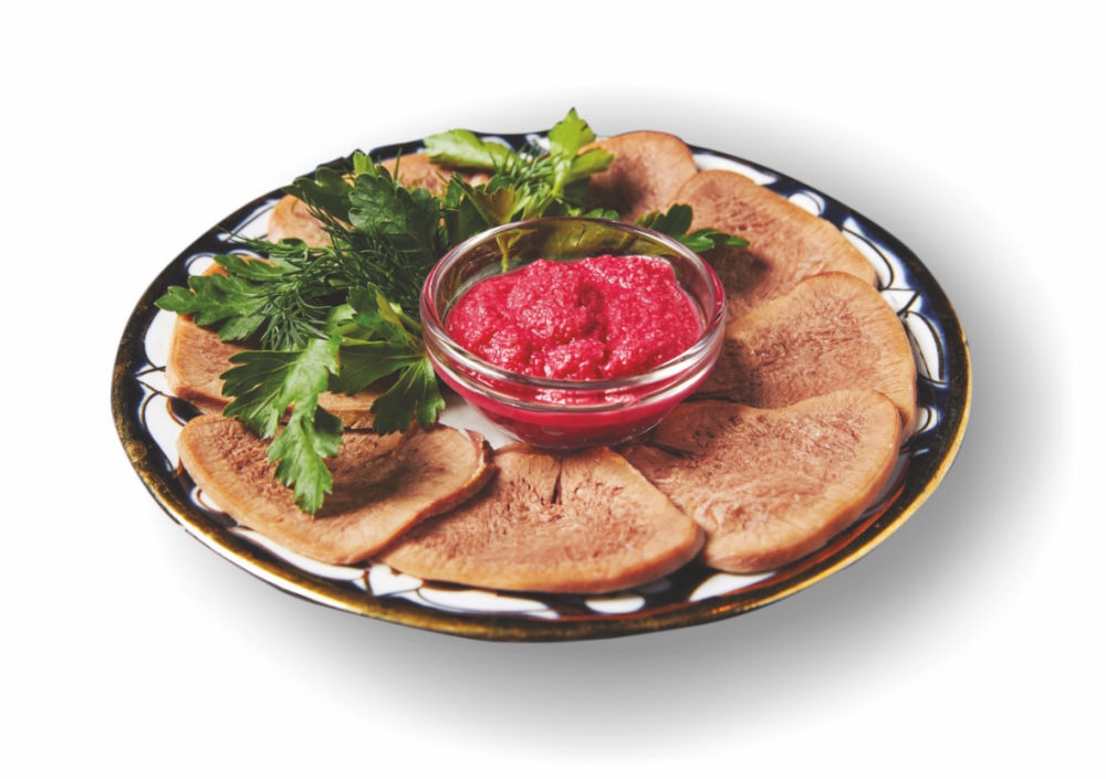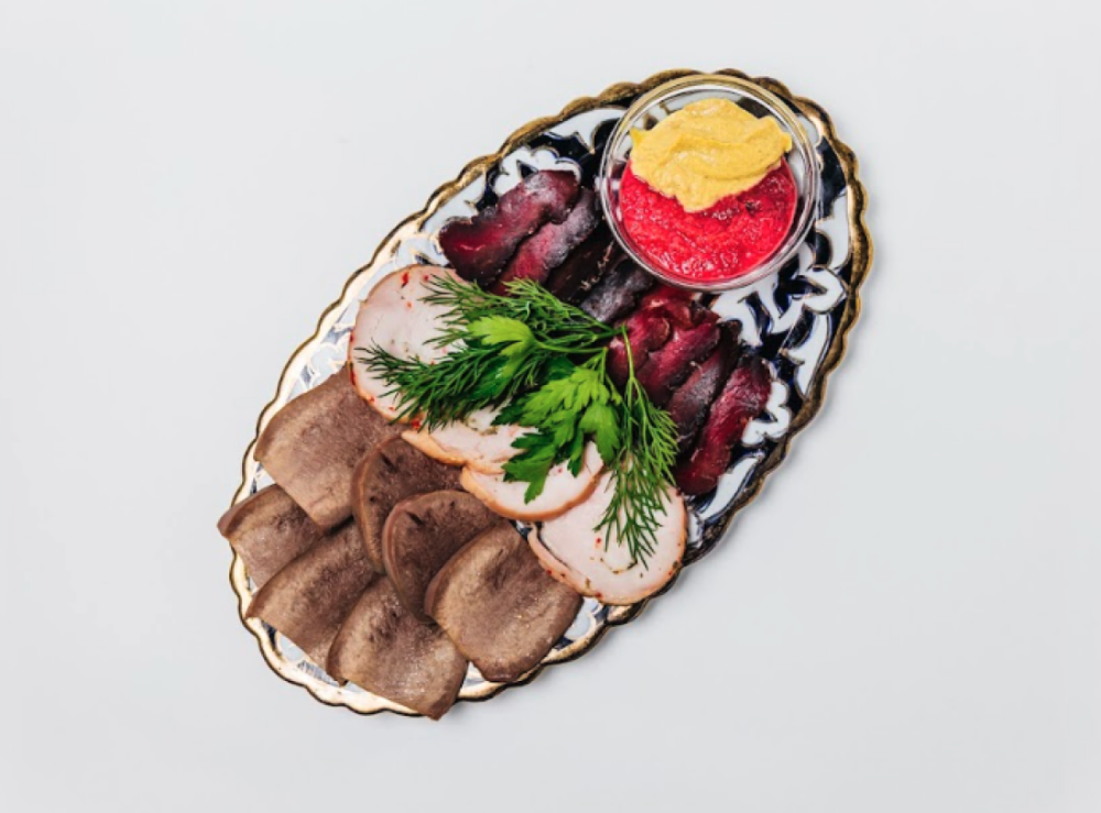 Нарезка мясных деликатесов: нежный говяжий язык, руляда из индейки и курицы, бастурма. Подается с хреном и горчицей.