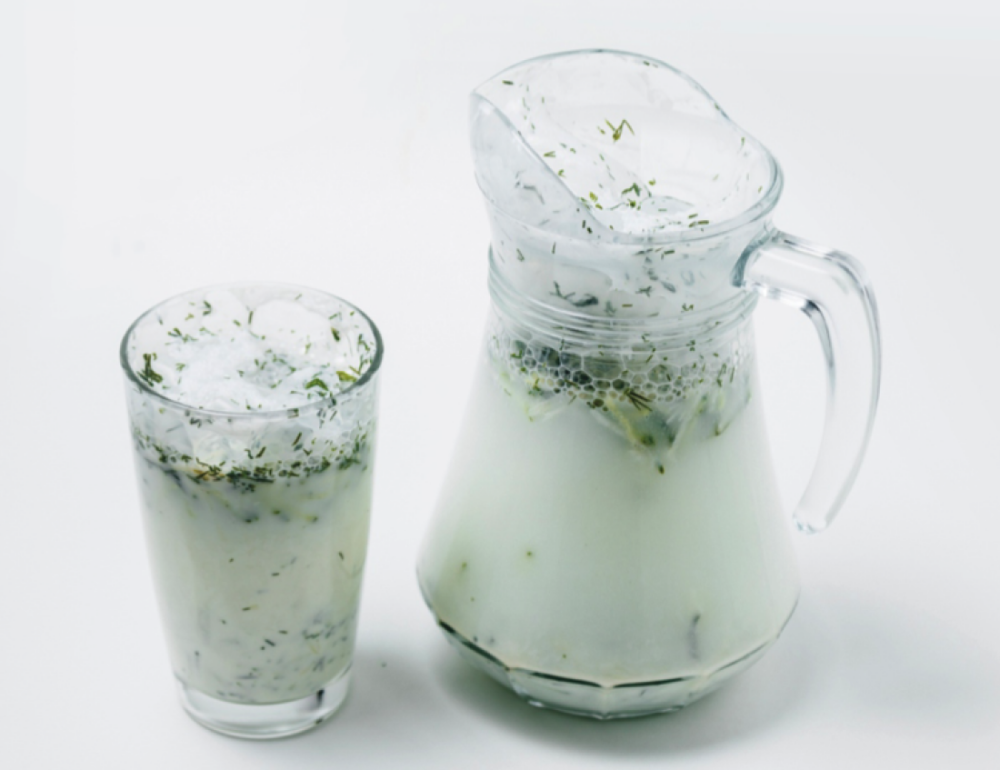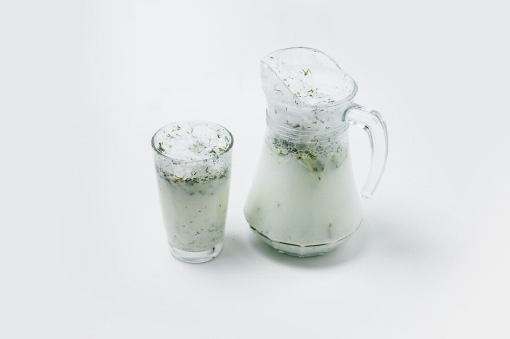Кисломолочный напиток с добавлением яблока, огурца, чеснока и зелени.