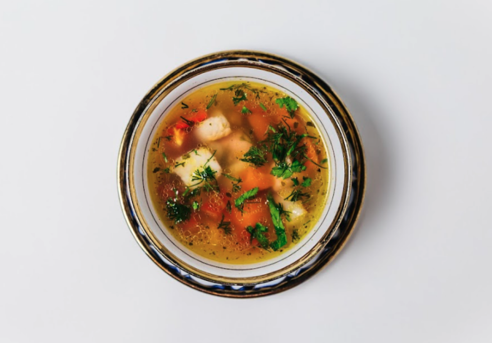 Наваристый рыбный суп из семги и хека с добавлением картофеля, моркови, лука и сладкого перца.