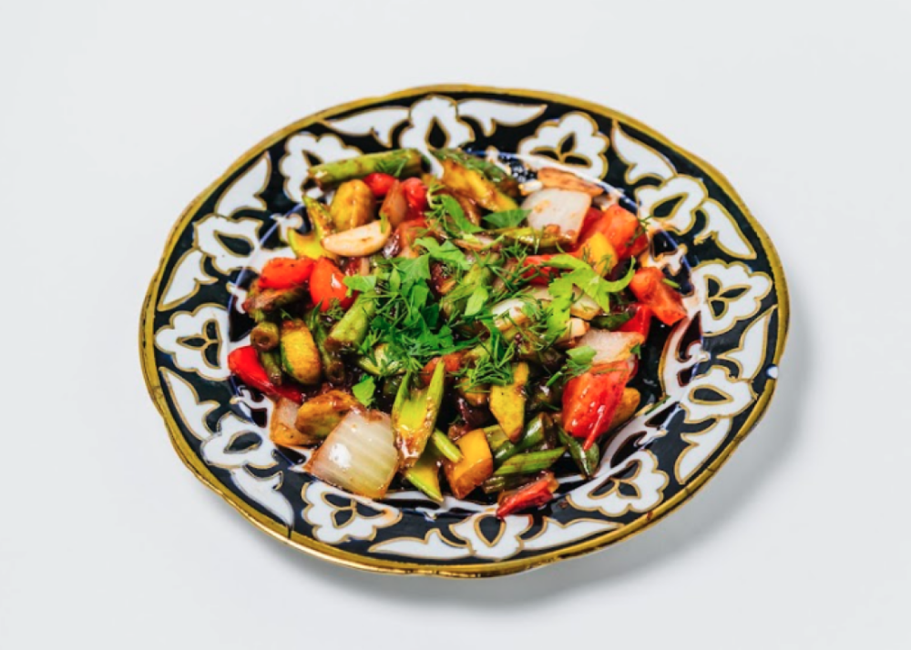 Обжаренные в воке томаты, сладкий перец, огурец, стручковая фасоль, сельдерей, репчатый лук и чеснок. Посыпается ароматной зеленью.