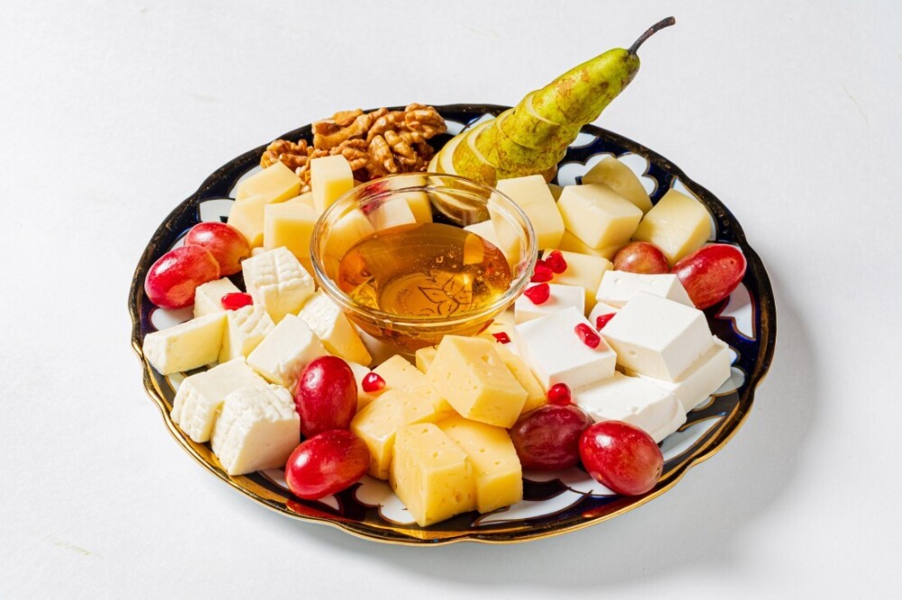 Пармезан, Брынза, Фета, Сулугуни, Российский. Подается с медом, грушей, виноградом, грецким орехом и гранатом.