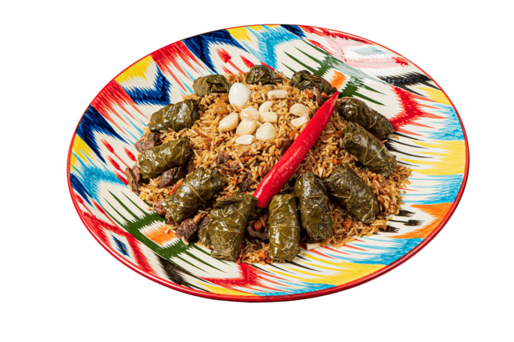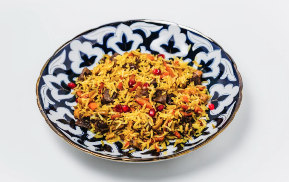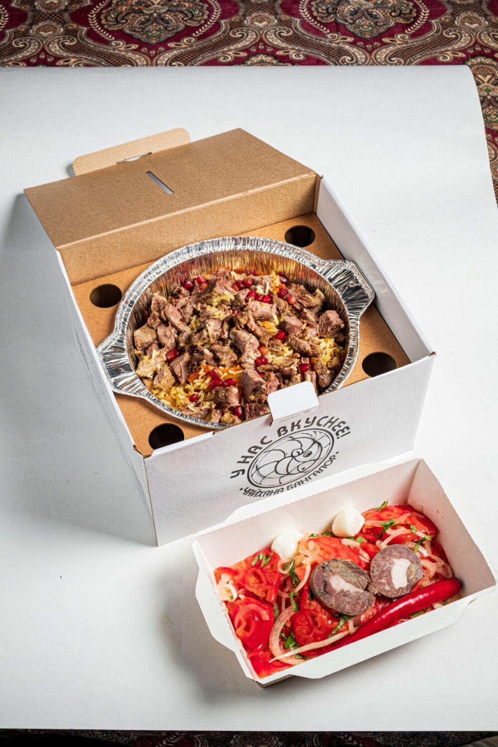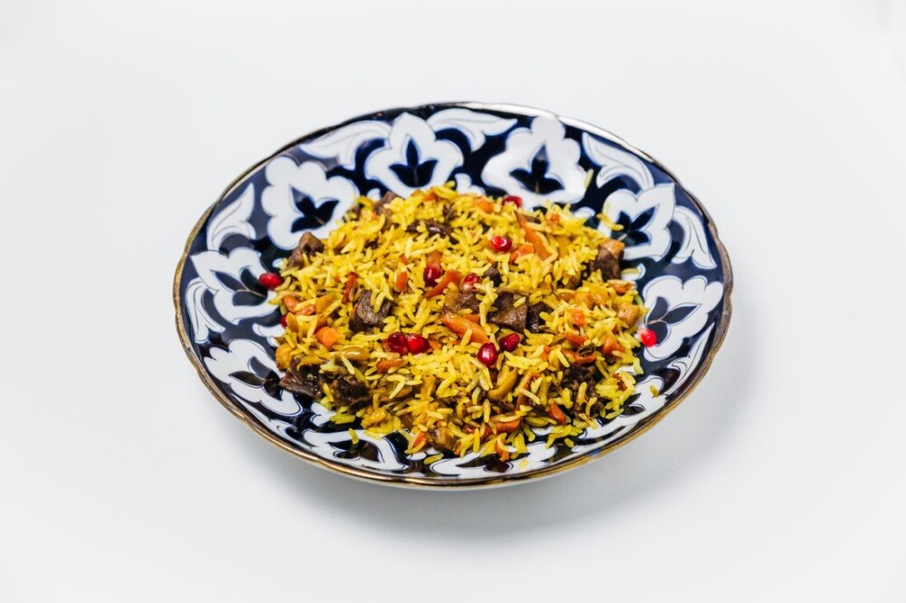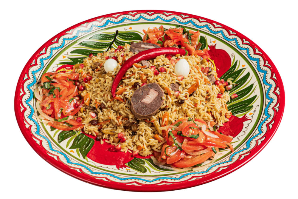 Праздничный плов, приготовленный по классическому рецепту в чугунном казане с мясом молодого курдючного барашка и рисом Лазер, с добавлением желтой и красной моркови, нута, изюма и зиры. Посыпается гранатом. К плову рекомендуется салат Ачик-чучук.