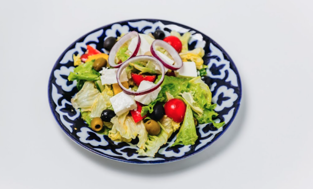 Вариация на тему классического греческого салата: сыр фета, томаты черри, сладкий перец, огурец, салат айсберг и лола, оливки, маслины, красный лук. Заправляется фирменным соусом.
