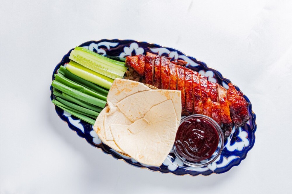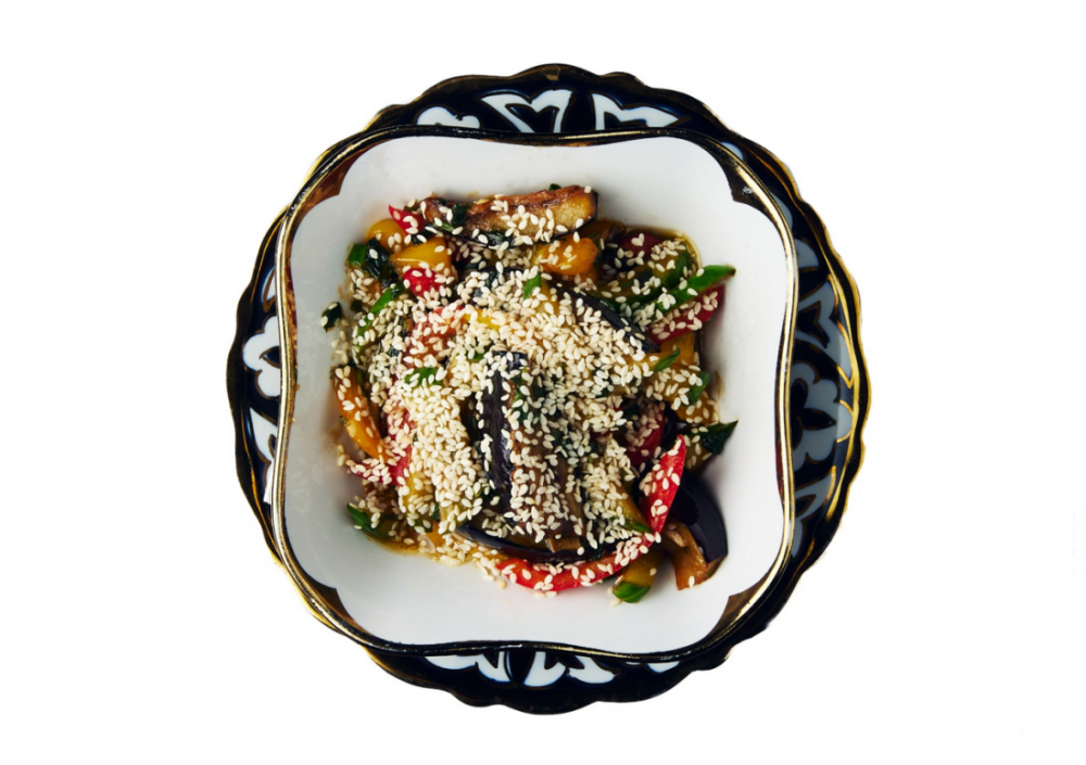 Теплый салат из обжаренных овощей: баклажан, сладкий перец, огурец и чеснок. Салат заправляется соевым соусом, посыпается ароматной зеленью и кунжутом.