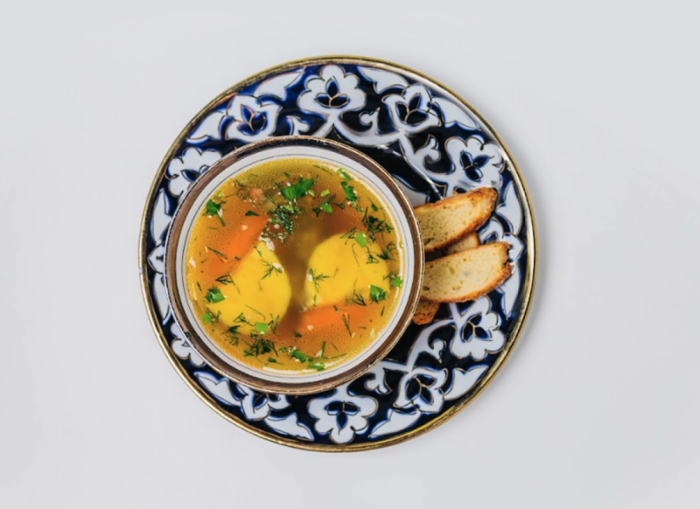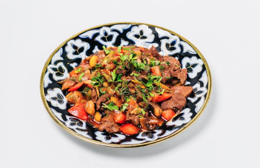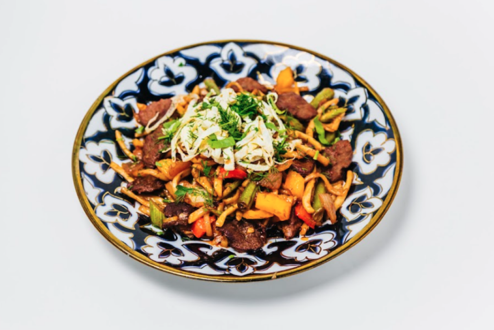 Традиционный узбекский суп из баранины и овощей обжаренных в воке с добавлением лапши вытянутой вручную. Посыпается ароматной зеленью. 350 г