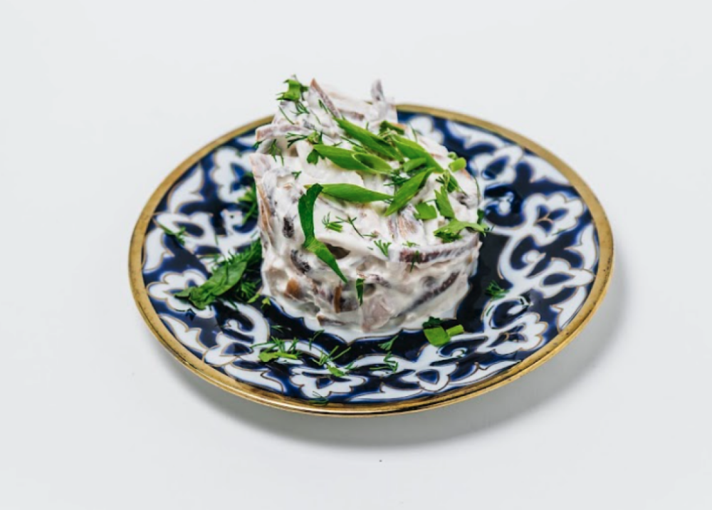 Сытный салат из отварного телячьего языка, телятины, куриного филе, копченой курочки с добавлением обжаренных шампиньонов. Заправляется домашним майонезом, украшается зеленью.