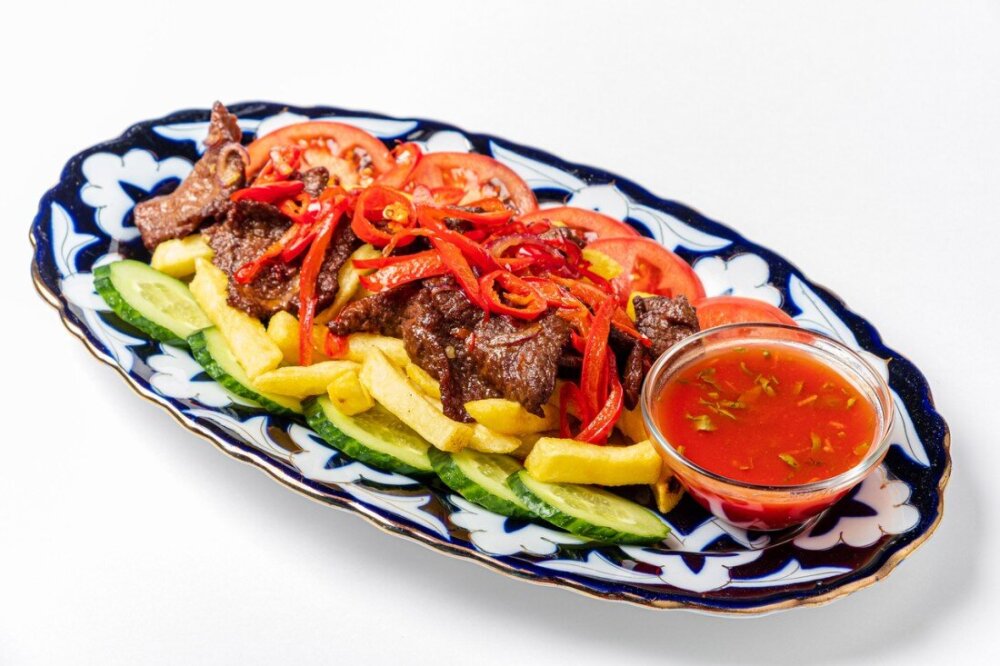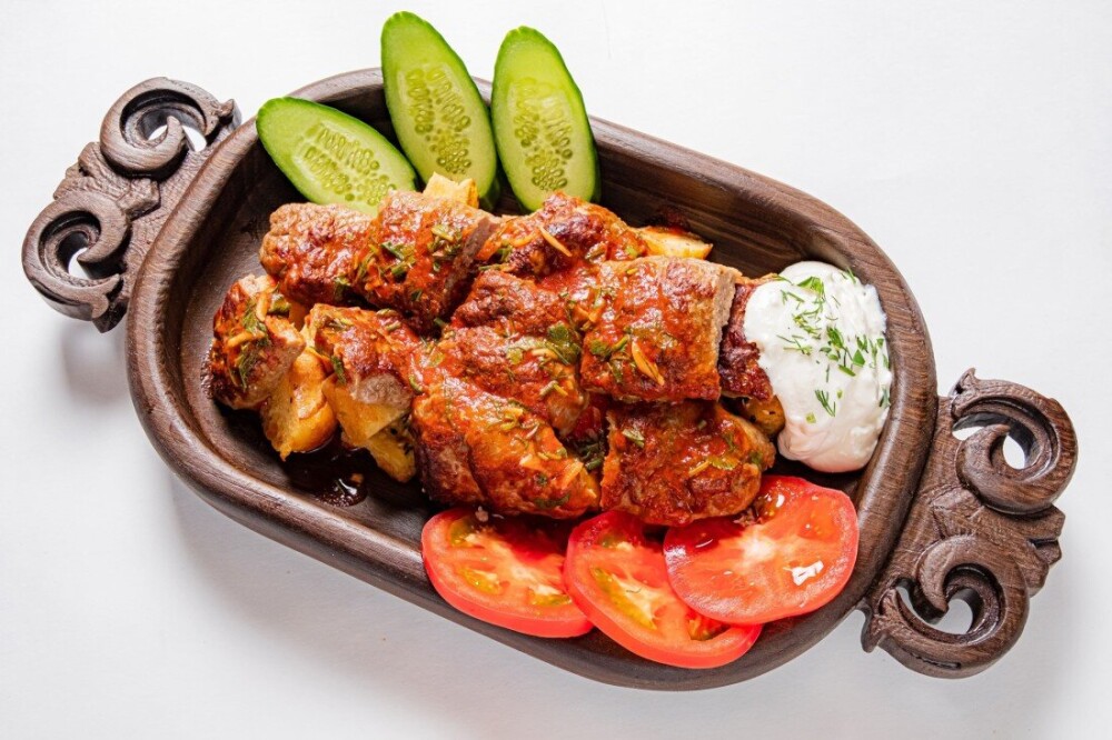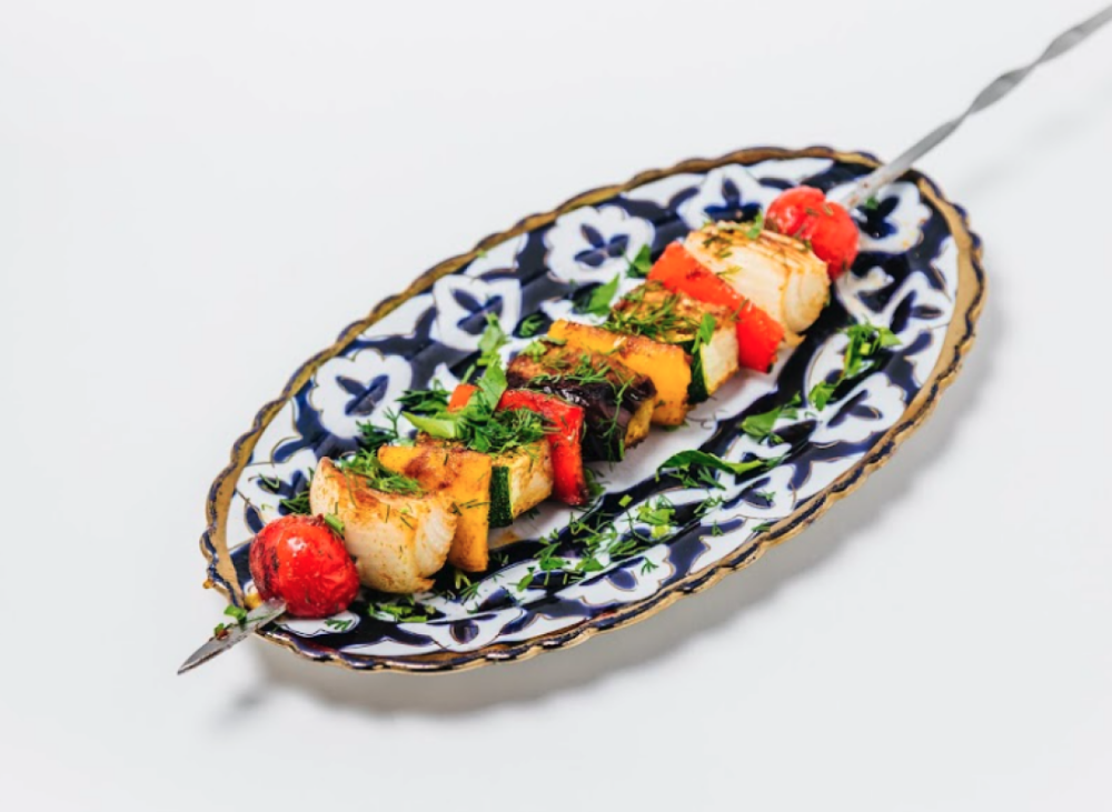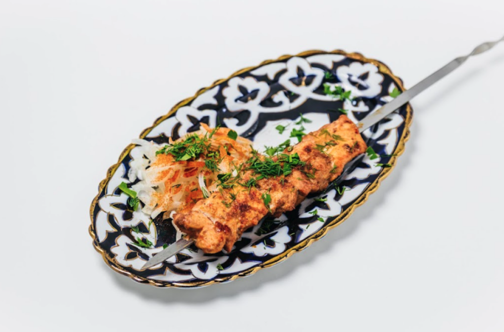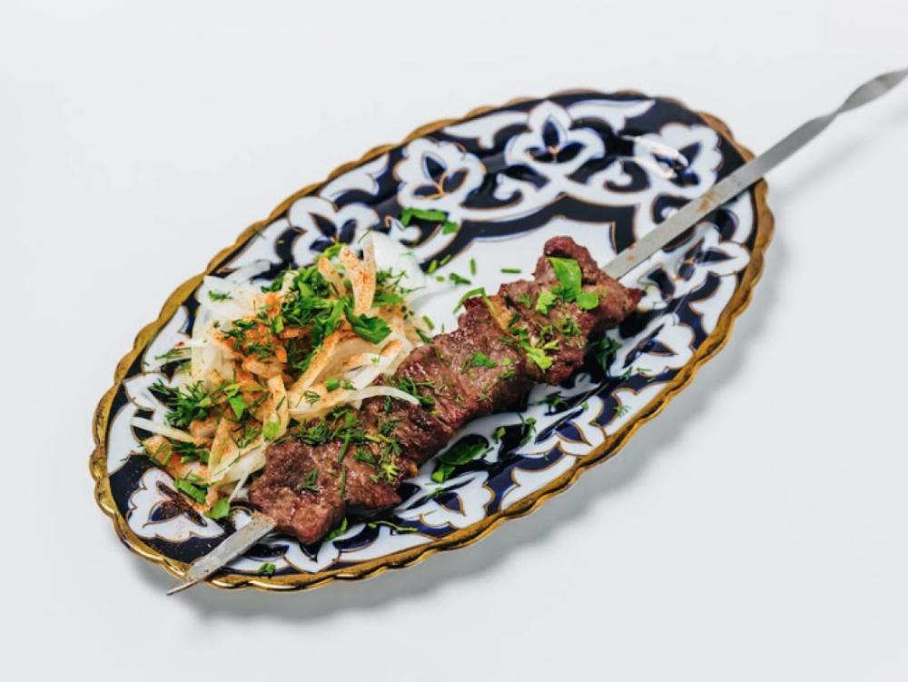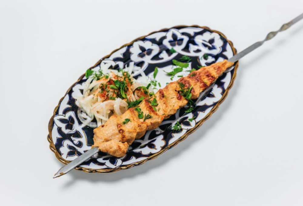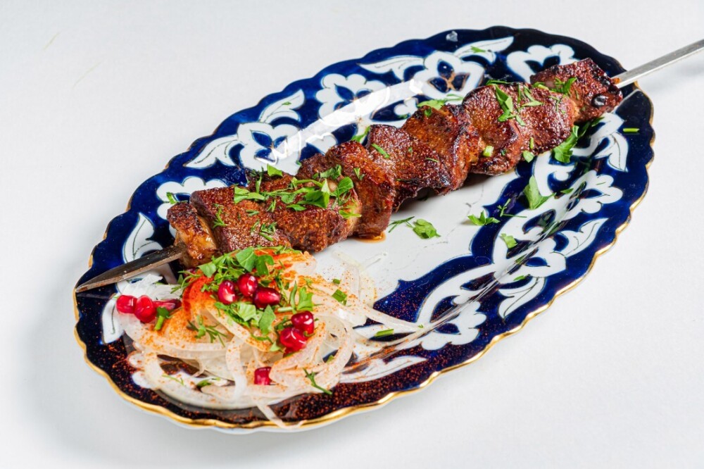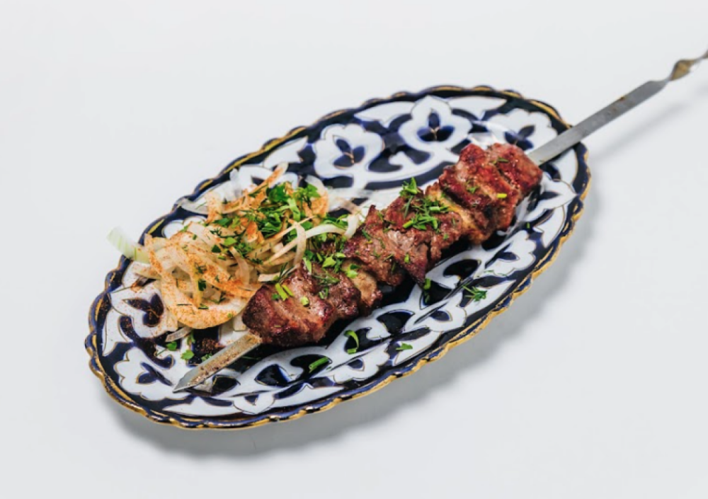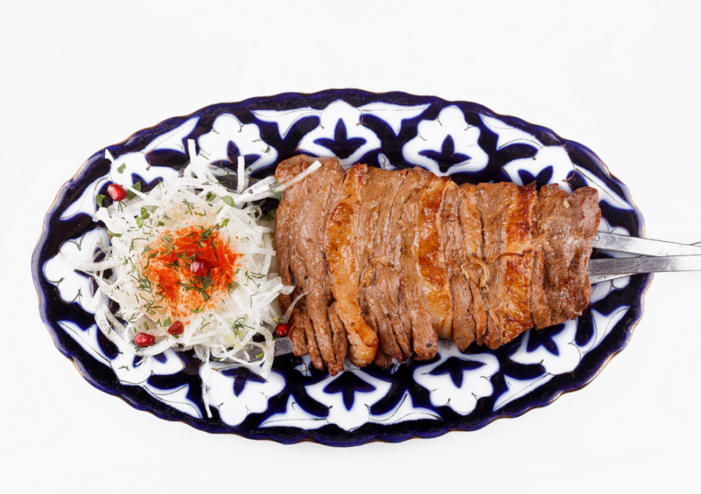 Узбекский шашлык из сочной телятины, ломтиков люля-кебаба из баранины и курдюка. Подается с маринованным луком.
