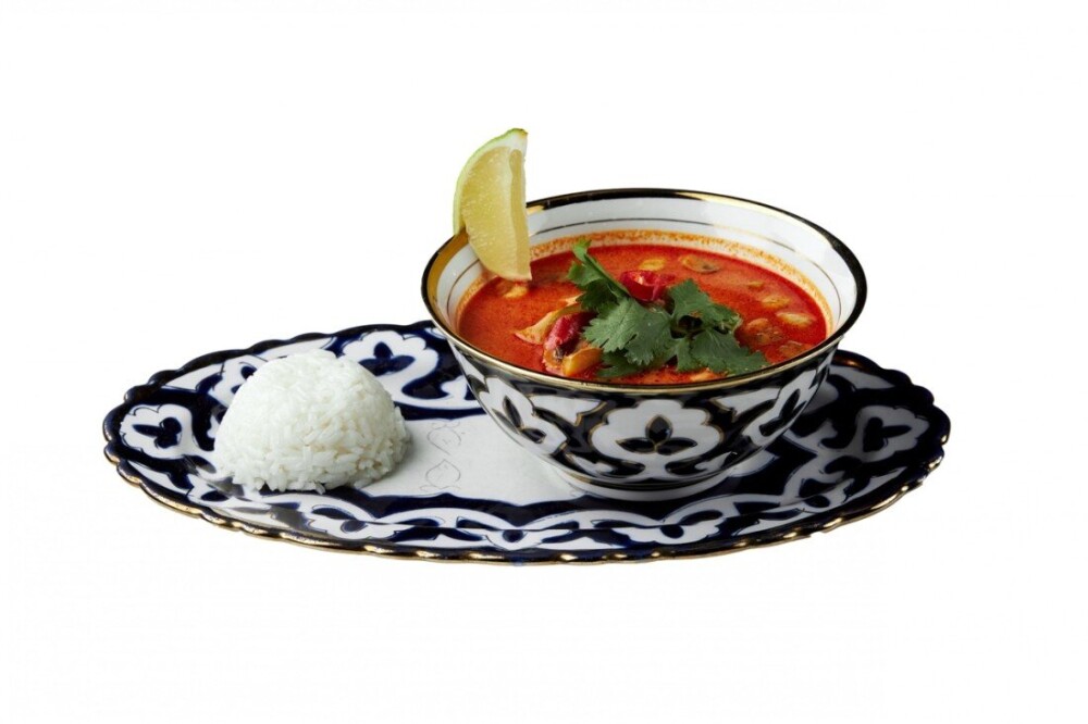 Пикантный суп на пряном бульоне и кокосовом молоке с морепродуктами: креветками, кальмарами, шампиньонами и мидиями. Подаётся с рисом и долькой лайма.