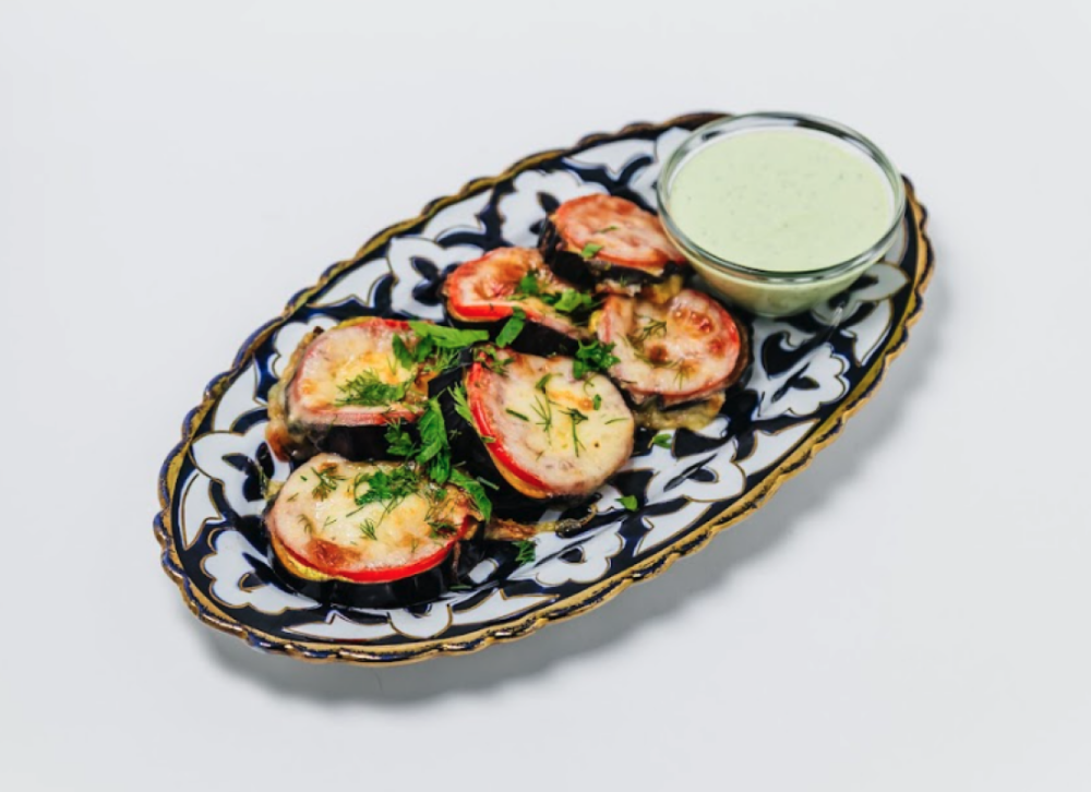 Баклажан запеченный с сыром, томатами, чесноком и зеленью. Подается с соусом Цахтоне.