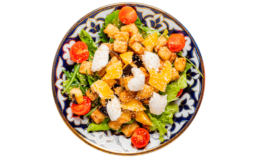 Сочный апельсин, творожный сыр, томаты Черри, ломтики баклажана, обжаренные до кисло-сладкой хрустящей корочки на подушке из листьев салата Лола и Айсберг, рукколы и фирменной заправки. Посыпается кунжутом.