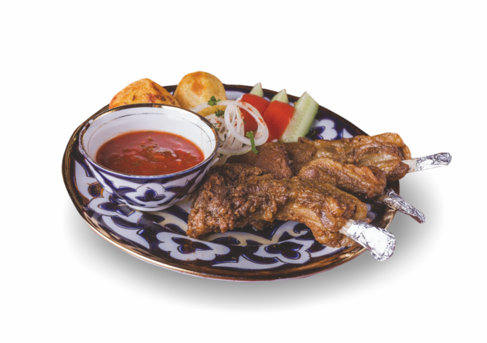 Традиционный узбекский шашлык, предварительно замаринованный в восточных специях. Готовится на трех шампурах, что делает его еще более сочным и нежным. Подается с маринованным лучком, гранатом и зеленью.