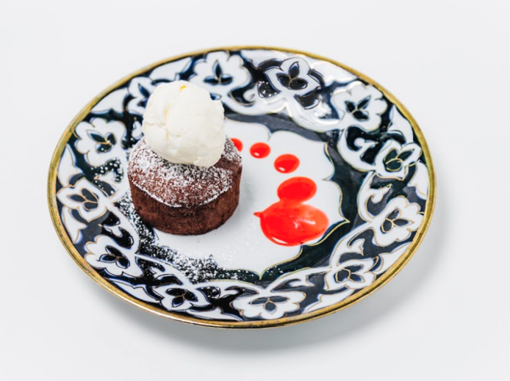Шоколадный кекс с начинкой из жидкого шоколада. Подается с шариком мороженого. Украшается сахарной пудрой и клубничным вареньем.