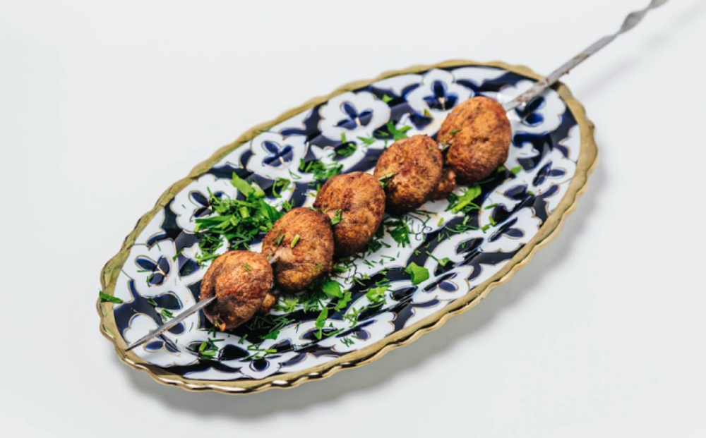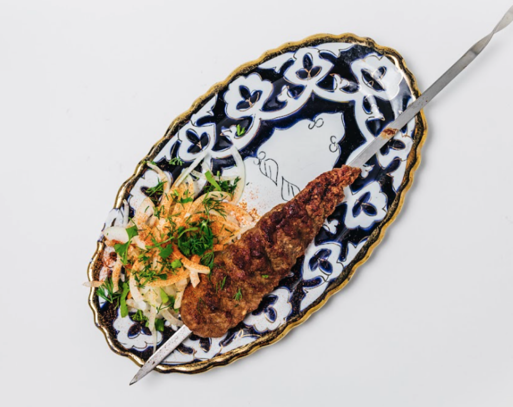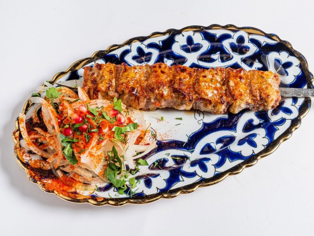 Шашлык из измельченной баранины, курдюка и репчатого лука. Подается с маринованным лучком, гранатом и зеленью.