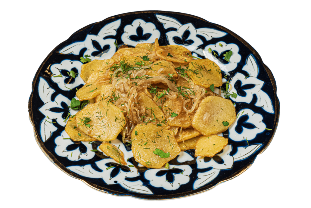 Обжаренный до золотистой корочки картофель с репчатым лучком. Посыпается ароматной зеленью.