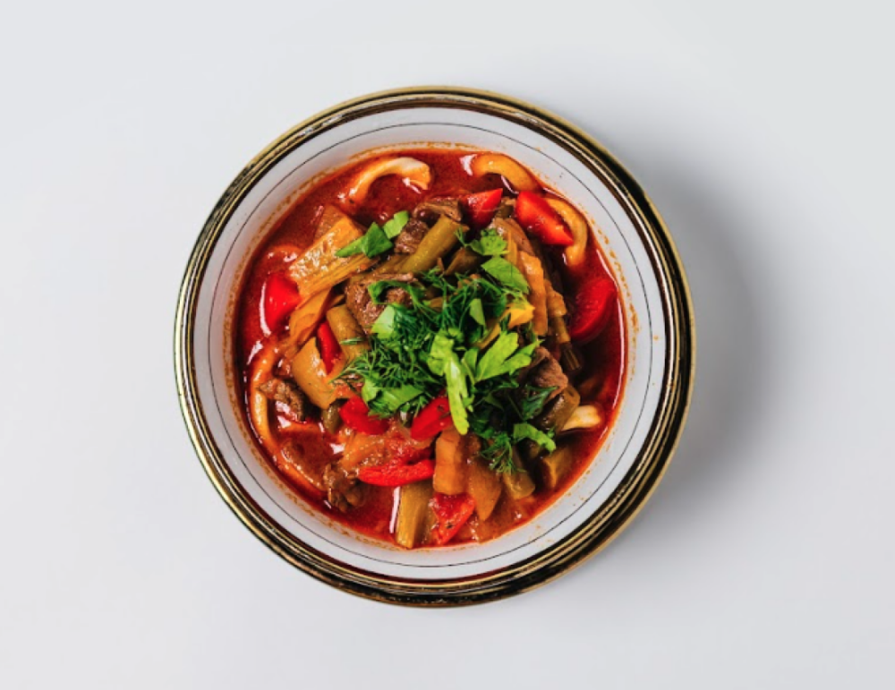 Наваристый суп из баранины, картофеля, моркови, сладкого перца, нута и ароматной зелени. Подается с хрустящими гренками.