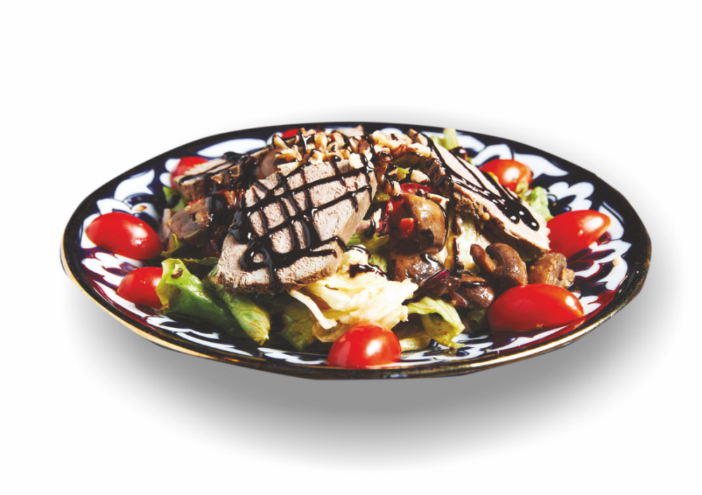 Фирменный салат с сочным ростбифом из говяжьей вырезки, маринованными шампиньонами, обжаренным сладким перцем, томатами черри, салатным луком, листьями салата айсберг и лола. Заправляется бальзамическим соусом и посыпается грецким орехом.