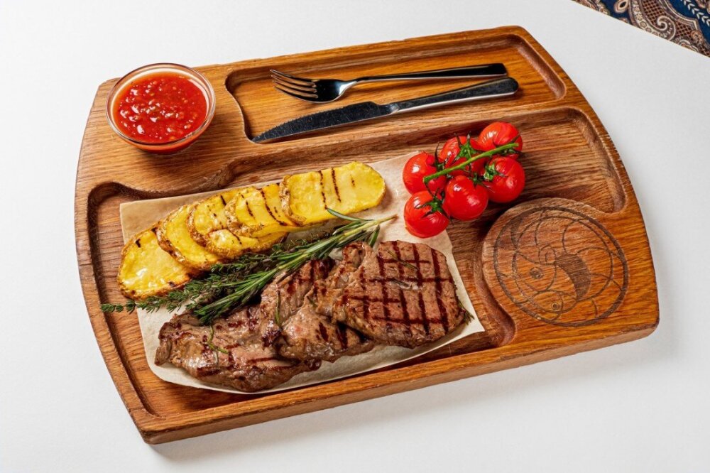 Шашлык из телятины с добавлением говяжьего жира, предварительно замаринованный в восточных специях. Подается с маринованным лучком, гранатом и зеленью.
