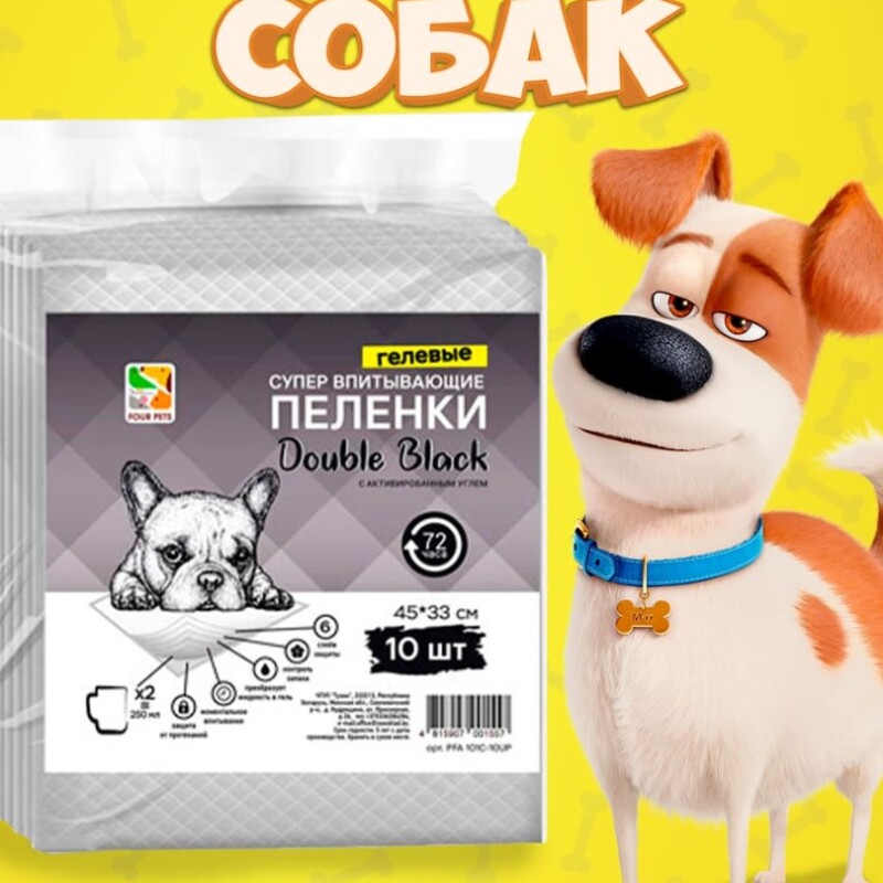 Пеленки для собак Four Pets Double Black с углем 45х33 см, 10 шт