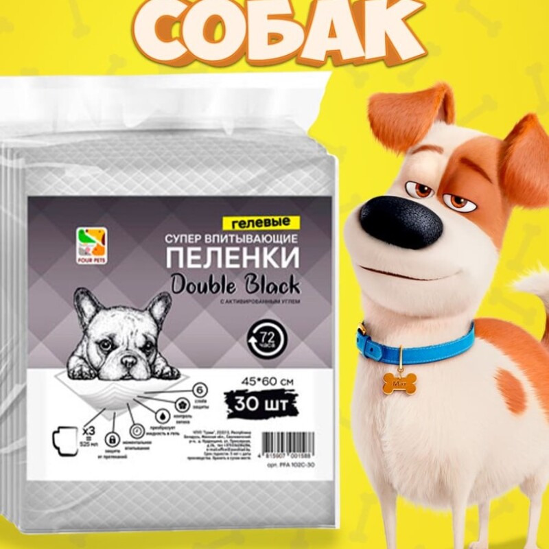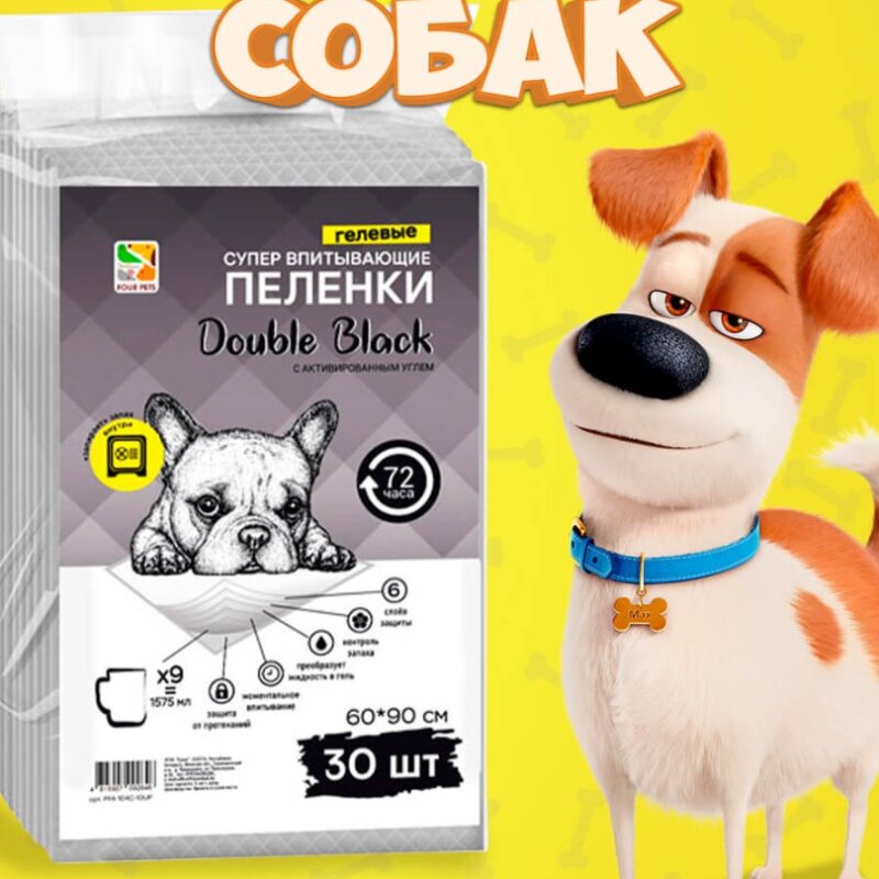 Пеленки для собак Four Pets Double Black с углем 60х60 см, 30 шт