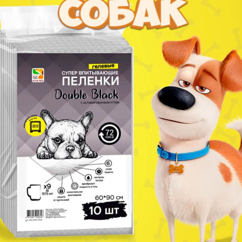 Пеленки для собак Four Pets Double Black с углем 60х90 см, 10 шт