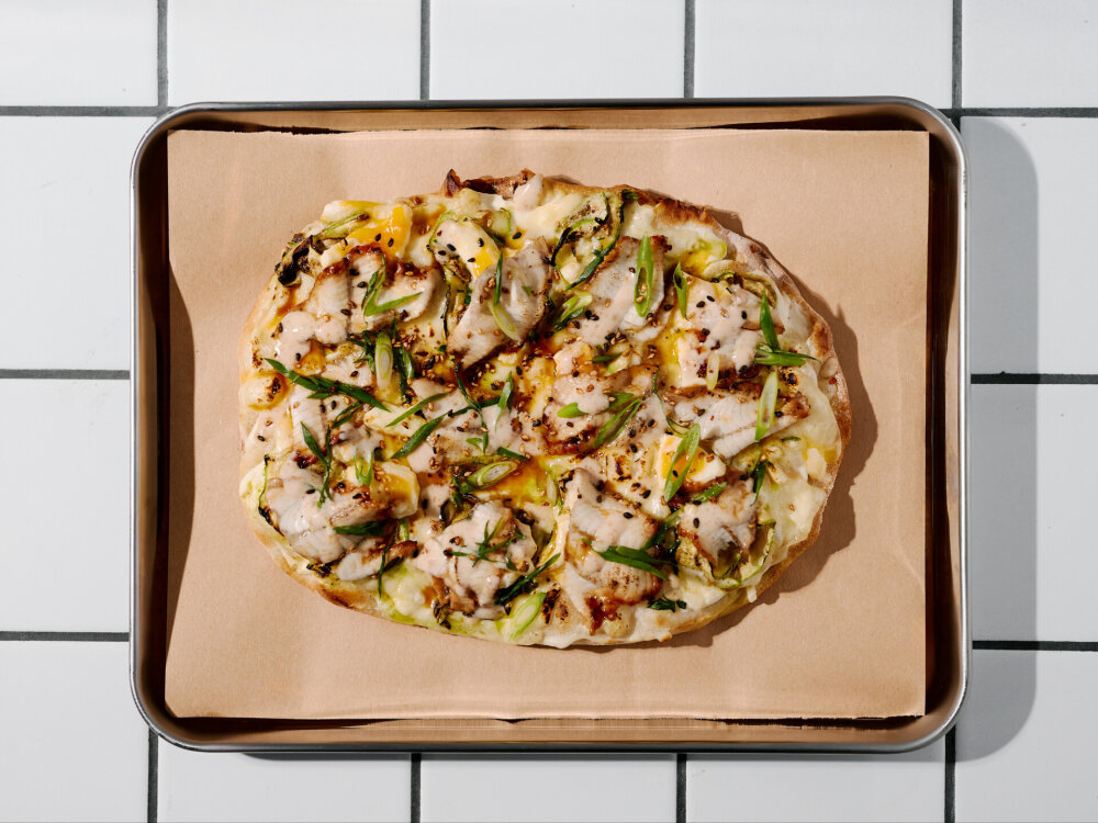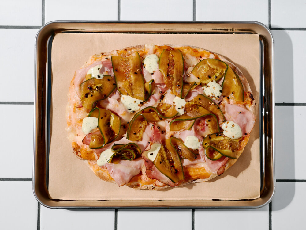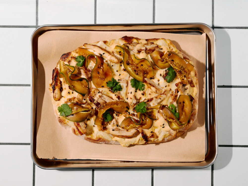Томатно-сливочный соус, сыр «Моцарелла», буженина, копченый сыр, огурец «Кимчи», медово-кунжутный соус
