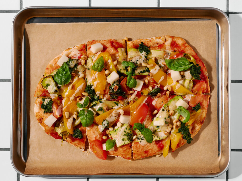 Печеный перец, черри, шпинат, веган «Фета», ореховый соус