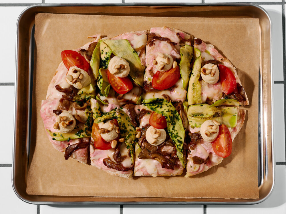Сыр «Моцарелла», черри, вешенки, хумус, кедровый орех, тесто