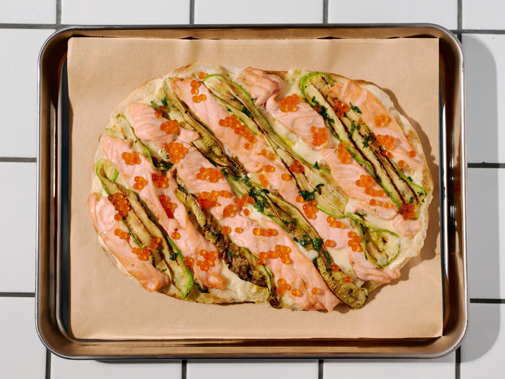 Трюфельный соус, сыр «Моцарелла», цукини, семга, икра крсная
