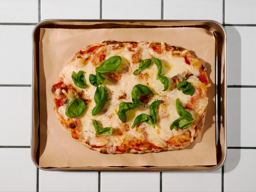 Томатно-базиликовый соус, сыр «Моцарелла», прошутто из Сан-Марино, рукола, сыр «Пармезан», бальзамик