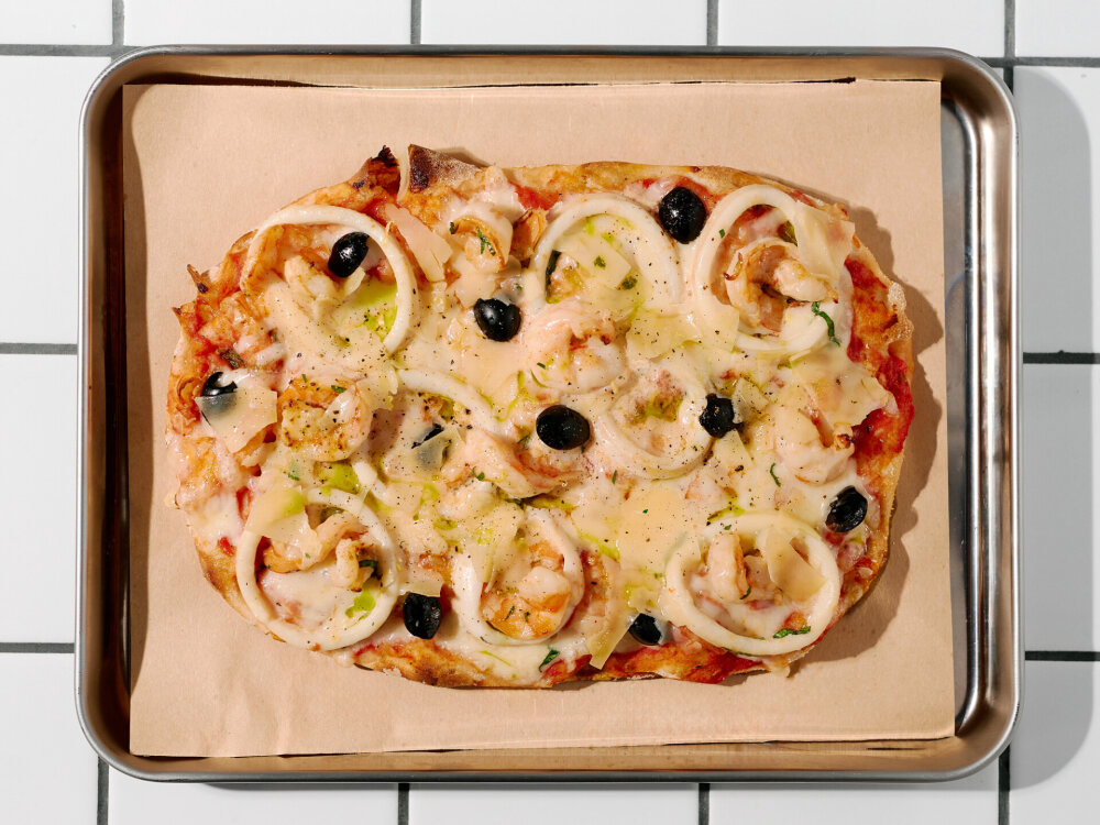 Томатно-базиликовый соус, сыр «Моцарелла», соус «Саке», маслины, петрушка, цедра лимона, маринованный кальмар, маринованная креветка