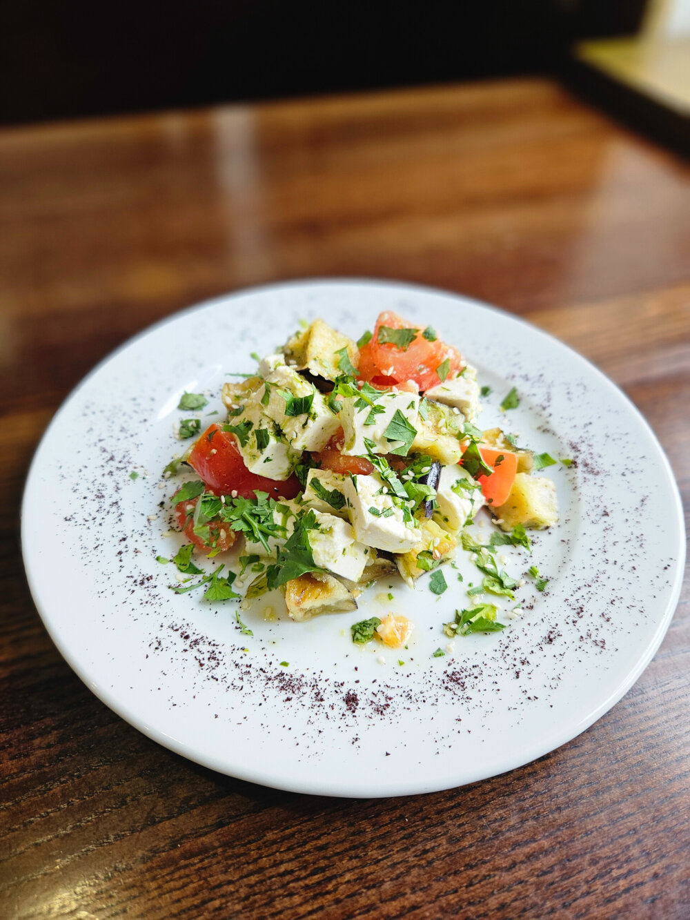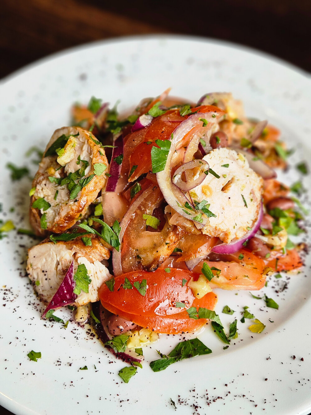 Овощи, печёный баклажан, имеретинский сыр, красный лук, мясо птицы