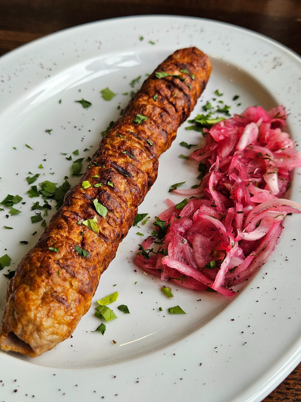 Свинина (шейная часть), грузинские специи, лук маринованный