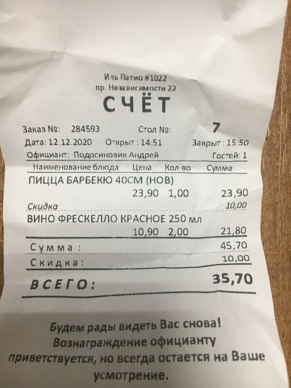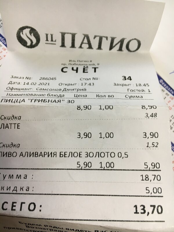Доставили быстрее, чем ожидал. Приветливый и вежливый персонал. Пицца великолепная, конкуренты из массмаркета и рядом не стояли