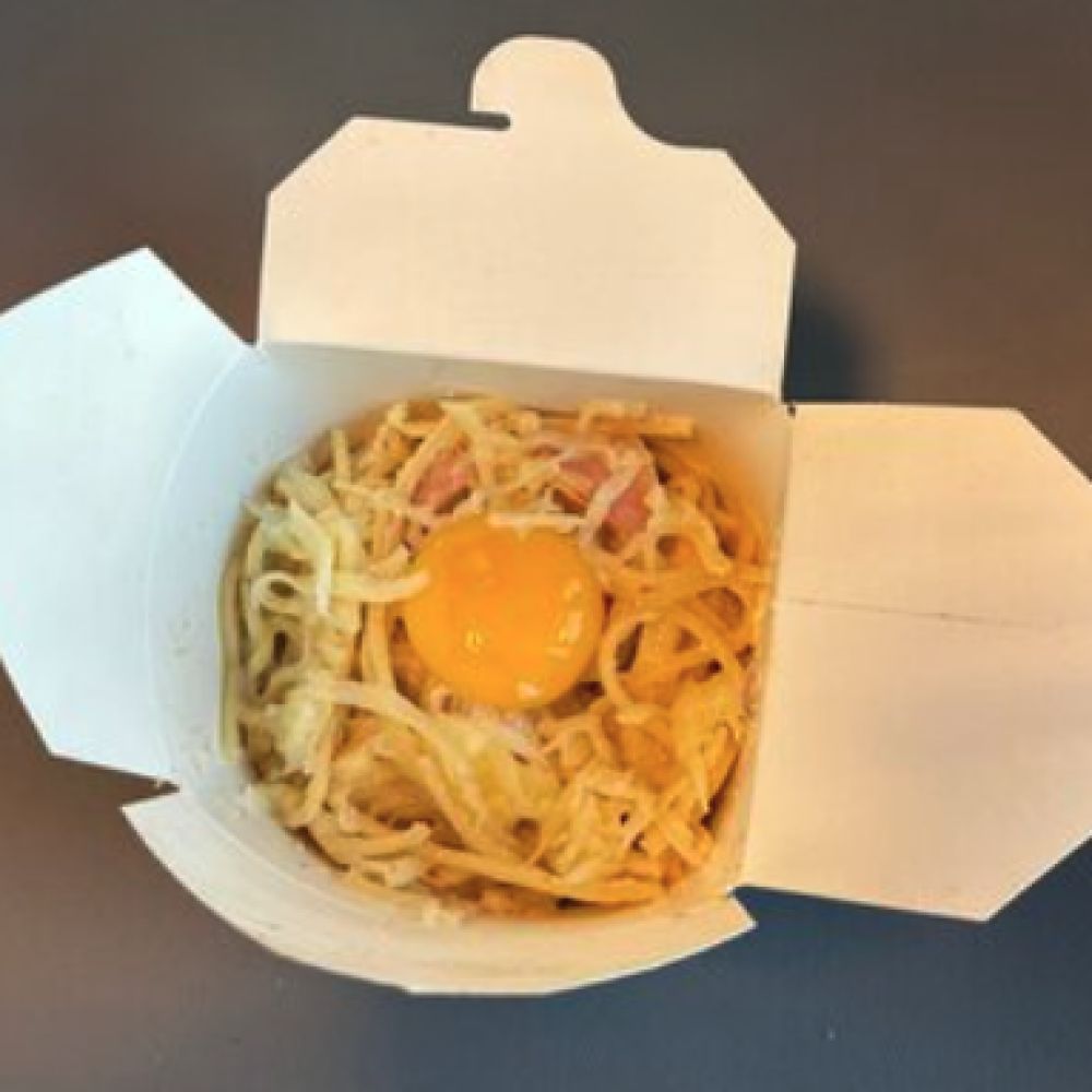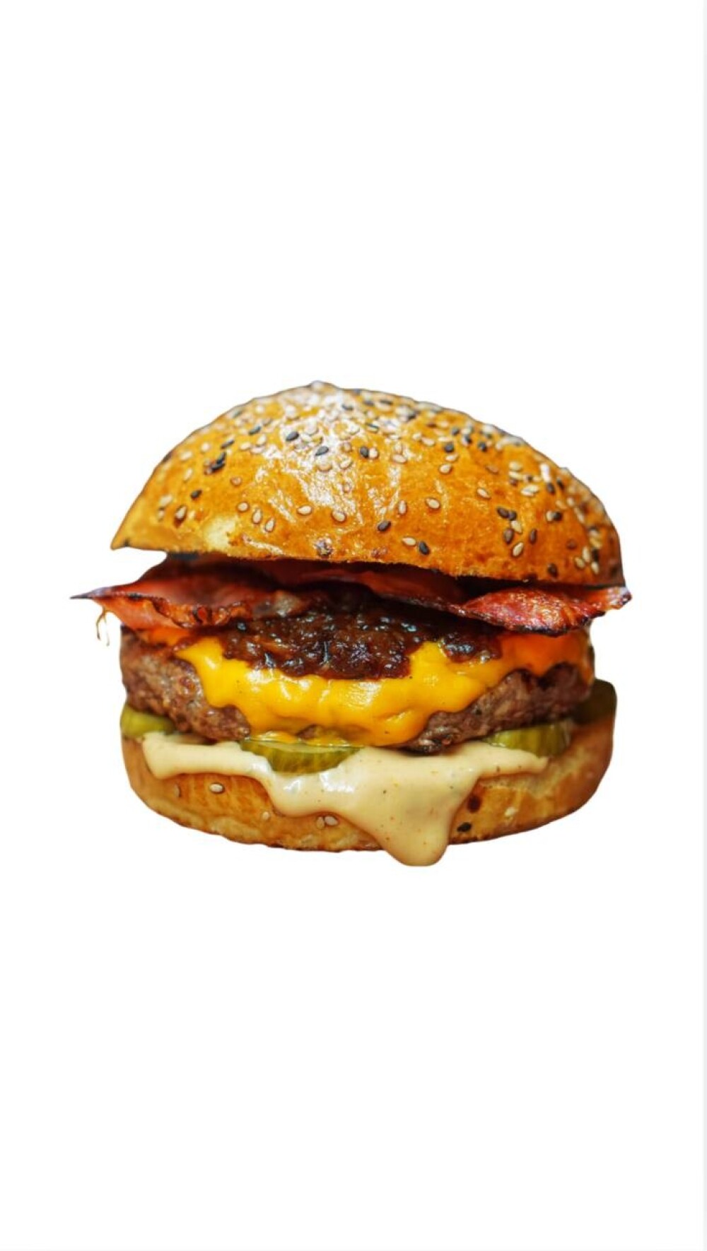Бриошь, яйцо, говядина, бекон, лук репчатый, маринованный огурец, сыр «Чеддер», помидор, салат «Айсберг», соус «Чили», соус «Барбекю»