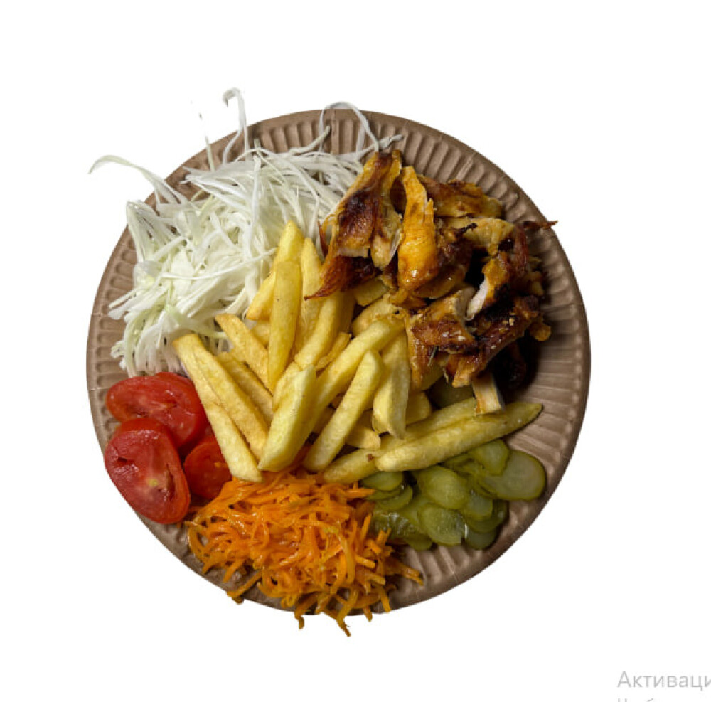 Курица, картофель фри, помидор, маринованный огурец, кетчуп, соус «Чесночный»