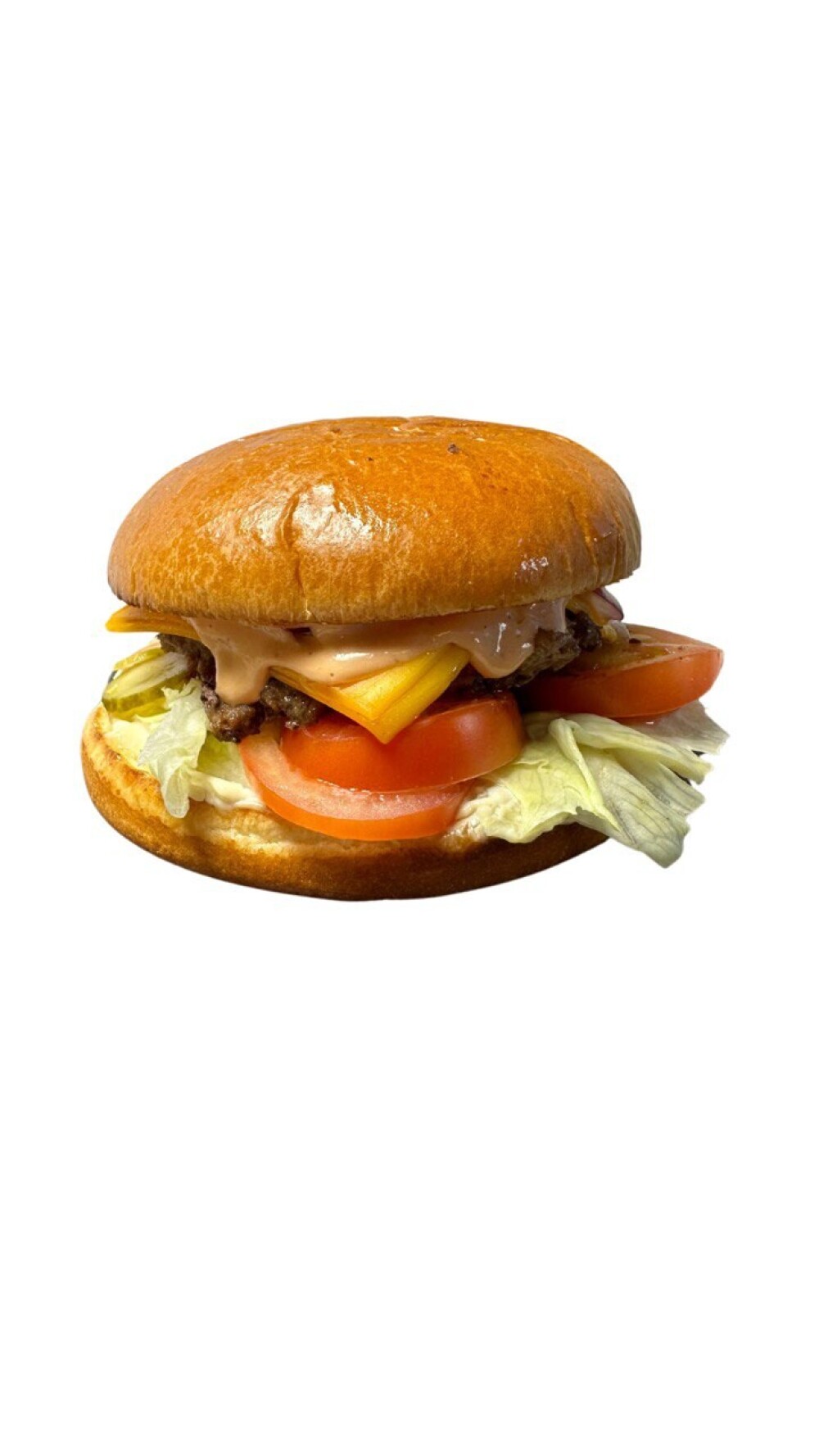 Бриошь, котлета из говядины, свежий огурец, лук репчатый, помидор, сыр «Чеддер», салат «Айсберг», соус «От шефа»