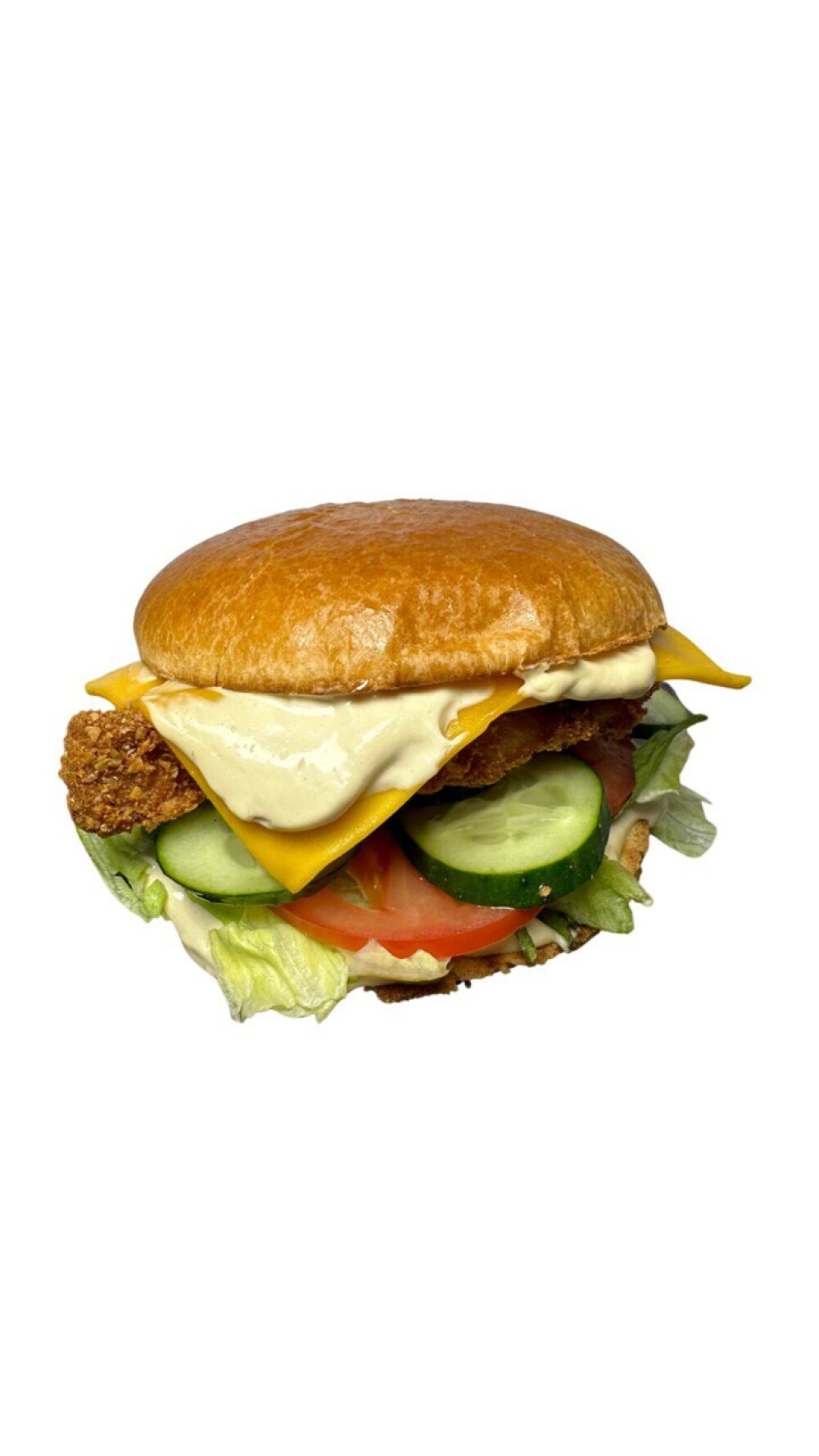 Бриошь, куриное филе, свежий огурец, сыр «Чеддер», салат «Айсберг», соус «Фирменный»