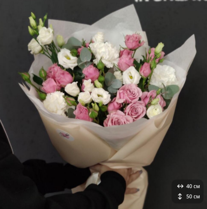 Эвкалипт 1 шт, кустовая роза 4 шт, гвоздика 3 шт, упаковка дизайнерская 1 шт, эустома белая 3 шт