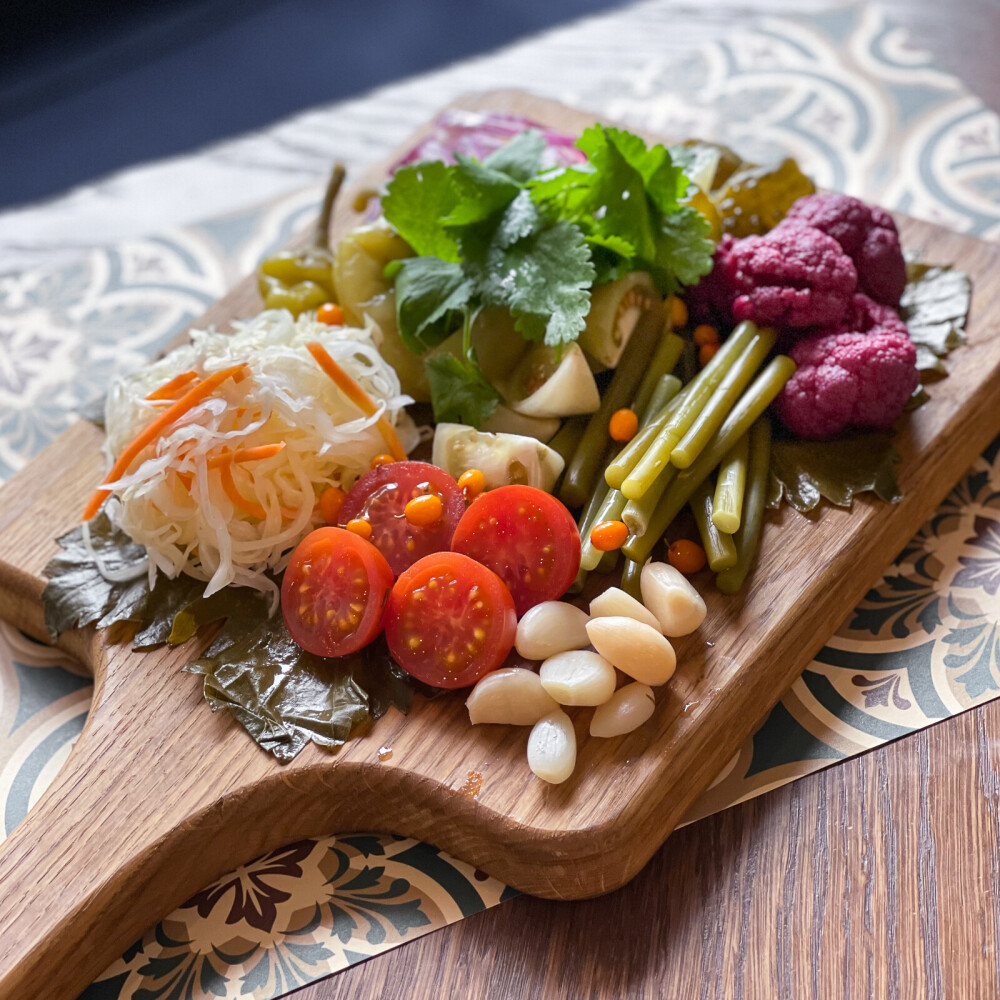 Гурийская капуста, квашеная капуста, бочковой огурец, помидор солёный, черри, перец чили, чеснок, лук