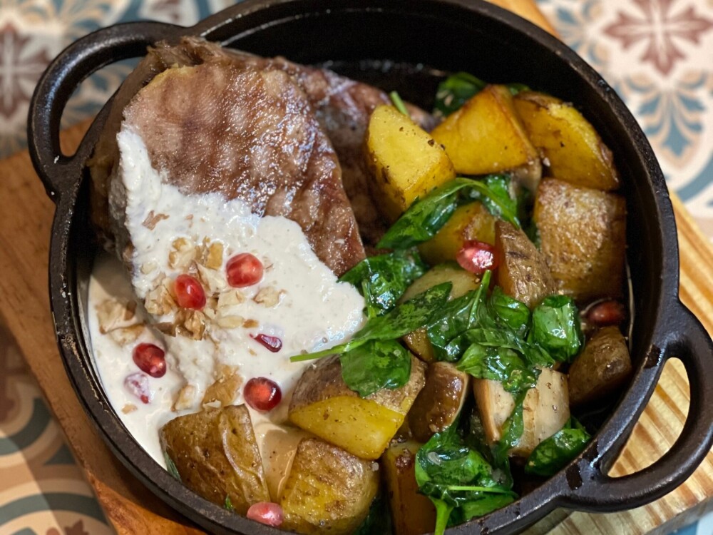 Обжаренный на гриле говяжий языки, сливочный соус, хрен, подаётся с жареным картофелем и белыми грибами